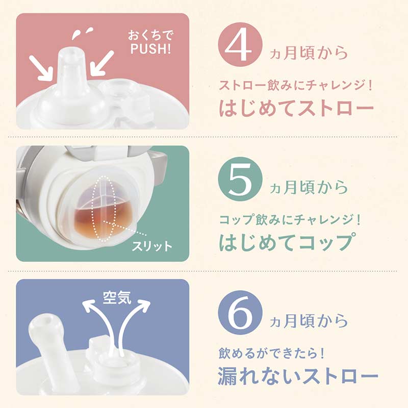 ●対象月齢:6ヵ月頃~ ●ボトル容量:240ml ●食洗器OK ※業務用食洗機を除く。 ●除菌・消毒(煮沸・電子レンジ・薬液)OK ●主要素材 キャップ:ポリプロピレン・熱可塑性エラストマー アダプター・ハンドル・ボトル:ポリプロピレン 飲み口・インナーストロー:合成ゴム(シリコーンゴム)
