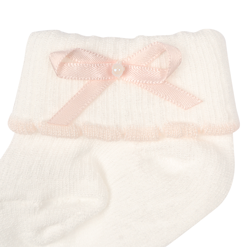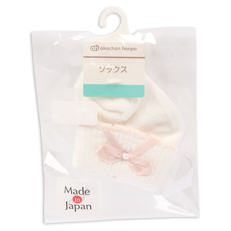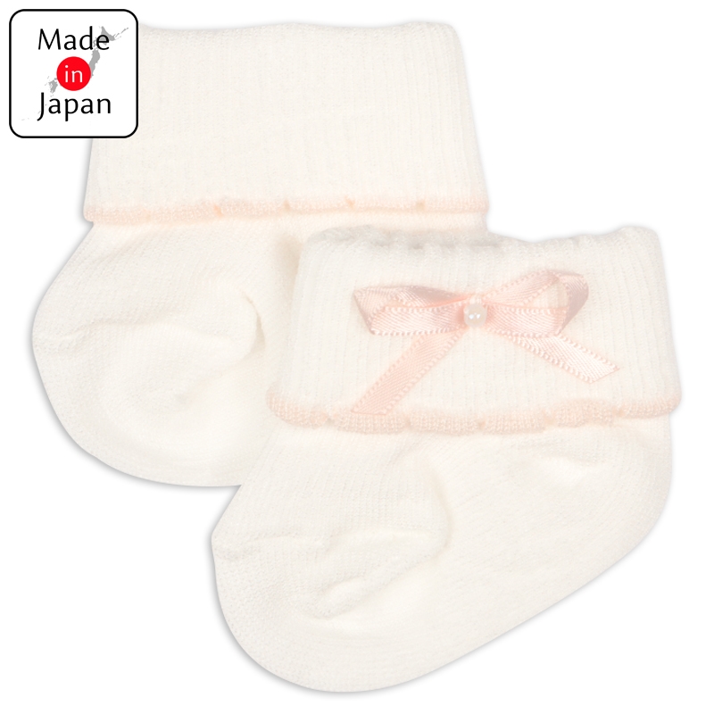 退院時やお宮参り、お披露目会などのセレモニーにもご使用いただける、国産新生児用のくつしたです。 折り返し部分にパールのついたピンクのリボンとピンクのピコがついている上品で可愛らしいデザインが特徴です。 赤ちゃんの晴れの日だけでなく、普段使いもできるアイテムです。