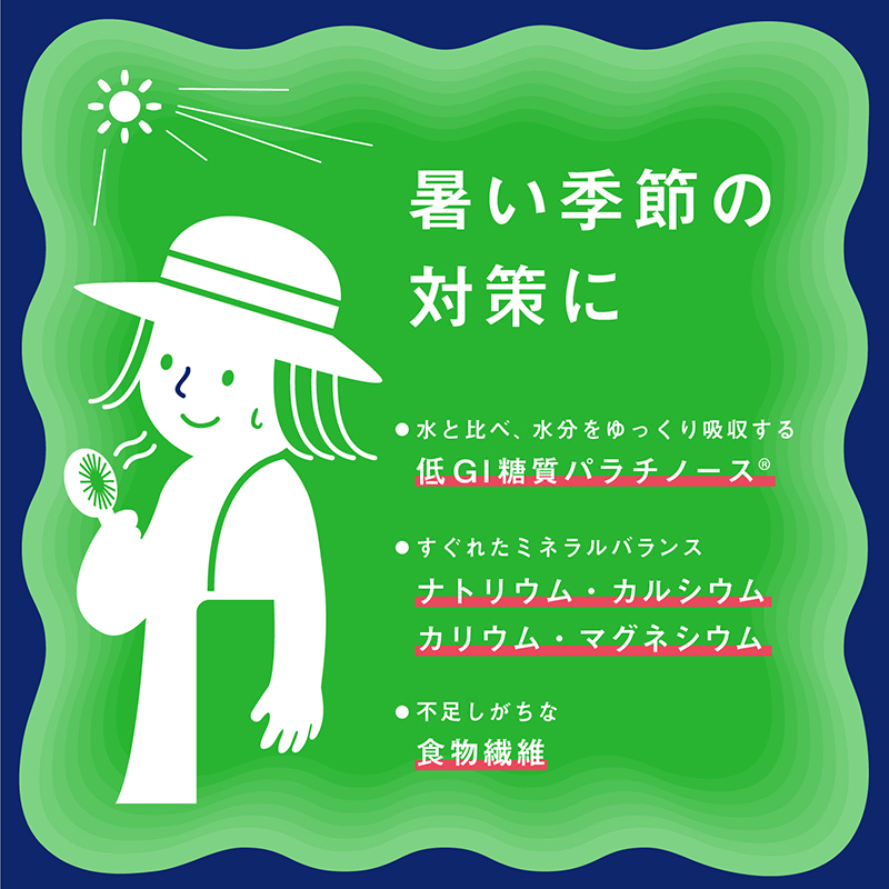 ●清涼飲料水 ●原材料名:パラチノース(ドイツ製造)、難消化性デキストリン、食塩/塩化K、乳酸Ca、酸味料、塩化Mg、甘味料(ラカンカ抽出物)、香料 ●内容量:195mL ●栄養成分:100ml当たり 熱量 33kcal たんぱく質 0g 脂質 0g 炭水化物 10g(糖質 6.5g 食物繊維 3.5g) 食塩相当量 0.127g カルシウム 4.3mg カリウム 18.5mg マグネシウム 1.4mg