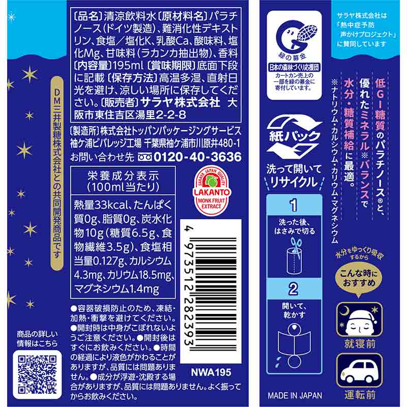 ●清涼飲料水 ●原材料名:パラチノース(ドイツ製造)、難消化性デキストリン、食塩/塩化K、乳酸Ca、酸味料、塩化Mg、甘味料(ラカンカ抽出物)、香料 ●内容量:195mL ●栄養成分:100ml当たり 熱量 33kcal たんぱく質 0g 脂質 0g 炭水化物 10g(糖質 6.5g 食物繊維 3.5g) 食塩相当量 0.127g カルシウム 4.3mg カリウム 18.5mg マグネシウム 1.4mg