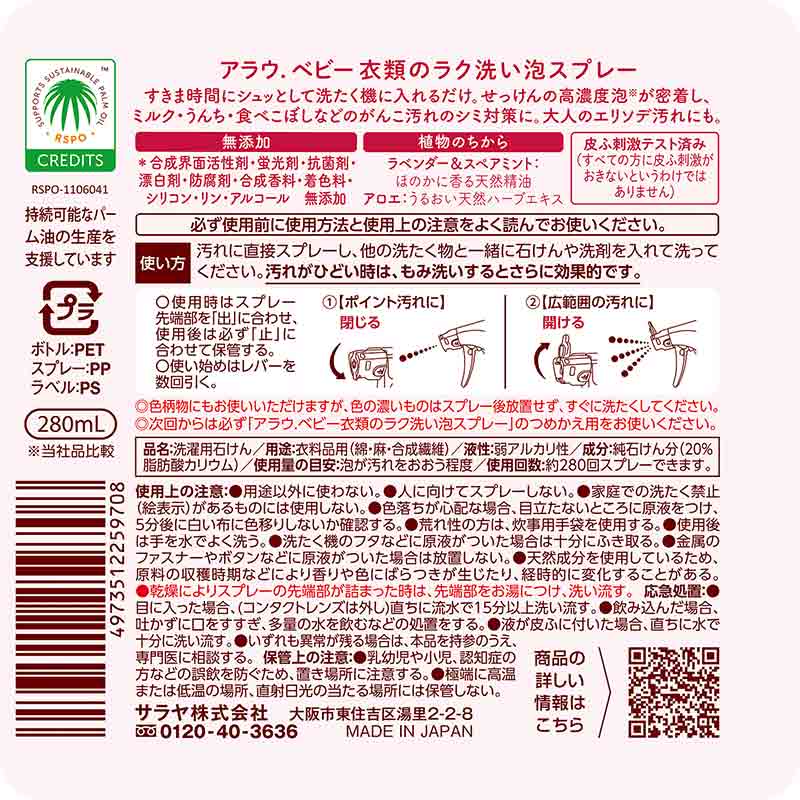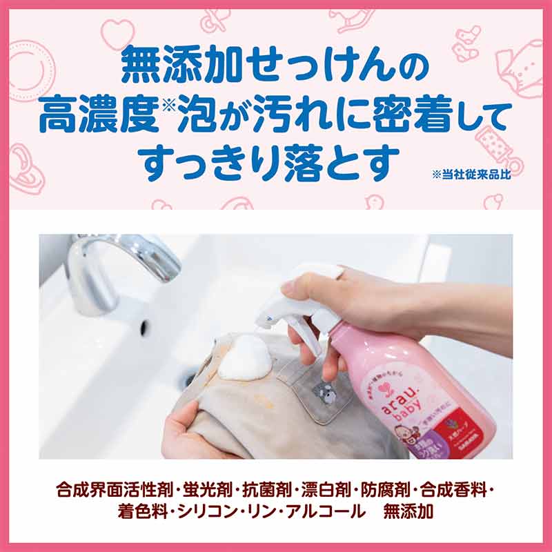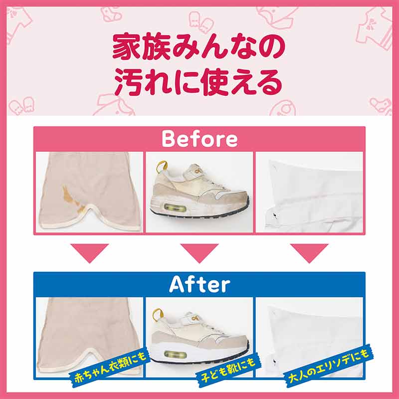 すきま時間に手軽にシュッとして洗濯機に入れるだけ。泡で簡単にシミ対策。 せっけんの高濃度泡が汚れに密着し、うんち・ミルク・食べこぼし・泥から、上履きや大人のエリソデ汚れまで幅広くしっかり落とします。 うるおいハーブアロエエキスを配合。