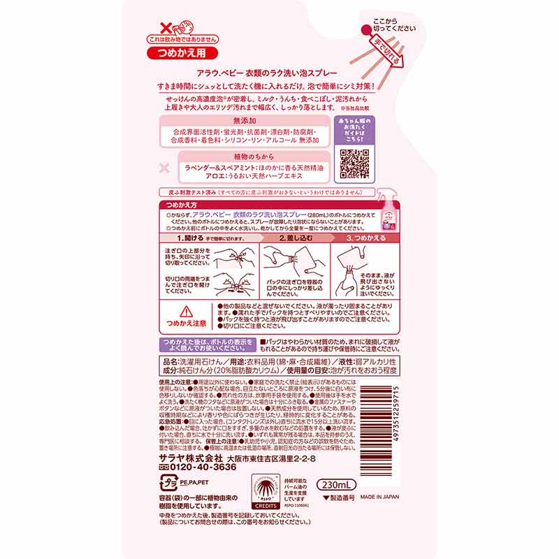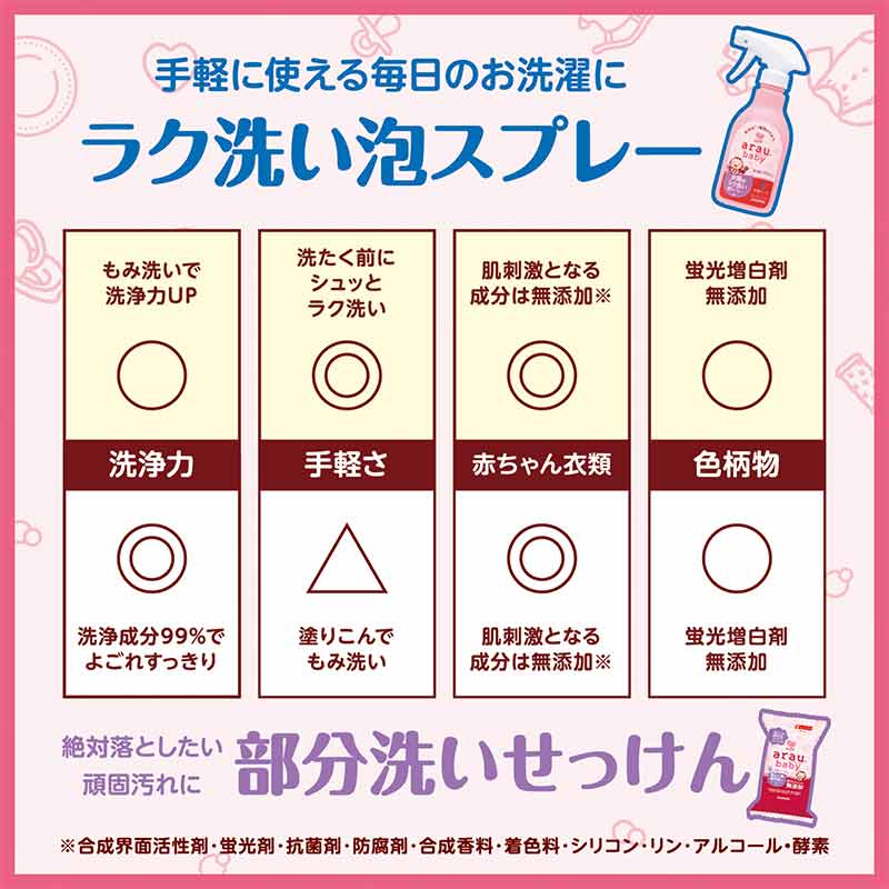 すきま時間に手軽にシュッとして洗濯機に入れるだけ。 泡で簡単にシミ対策。 せっけんの高濃度泡が汚れに密着し、うんち・ミルク・食べこぼし・泥から、上履きや大人のエリソデ汚れまで幅広くしっかり落とします。 うるおいハーブアロエエキスを配合。
