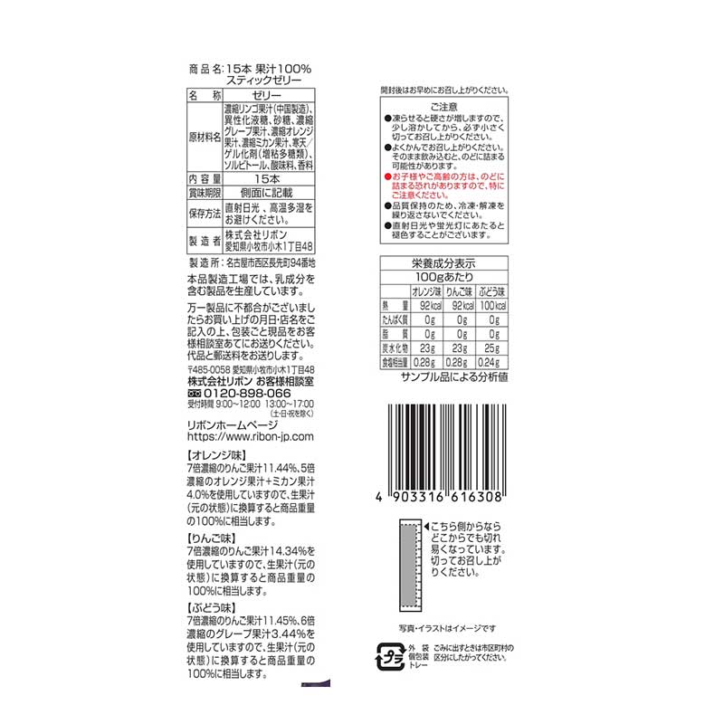 ●ゼリー ●原材料名:濃縮リンゴ果汁(中国製造)、異性化液糖、砂糖、濃縮グレープ果汁、濃縮オレンジ果汁、濃縮ミカン果汁、寒天/ゲル化剤(増粘多糖類)、ソルビトール、酸味料、香料 ●内容量:15本 ●栄養成分:その他 100gあたり オレンジ味:熱量 92kcal たんぱく質 0g 脂質 0g 炭水化物 23g 食塩相当量 0.28g りんご味:熱量 92kcal たんぱく質 0g 脂質 0g 炭水化物 23g 食塩相当量 0.28g ぶどう味:熱量 100kcal たんぱく質 0g 脂質 0g 炭水化物 25g 食塩相当量 0.24g