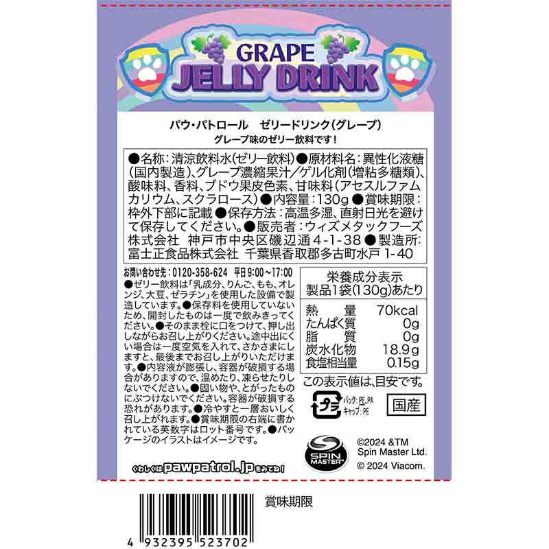 ・清涼飲料水(ゼリー飲料) ・原材料名:異性化液糖(国内製造)、グレープ濃縮果汁/ゲル化剤(増粘多糖類)、酸味料、香料、ブドウ果皮色素、甘味料(アセスルファムカリウム、スクラロース) ・内容量:130g ・栄養成分:製品1袋(130g)あたり 熱量 70kcal たんぱく質 0g 脂質 0g 炭水化物 18.9g 食塩相当量 0.15g