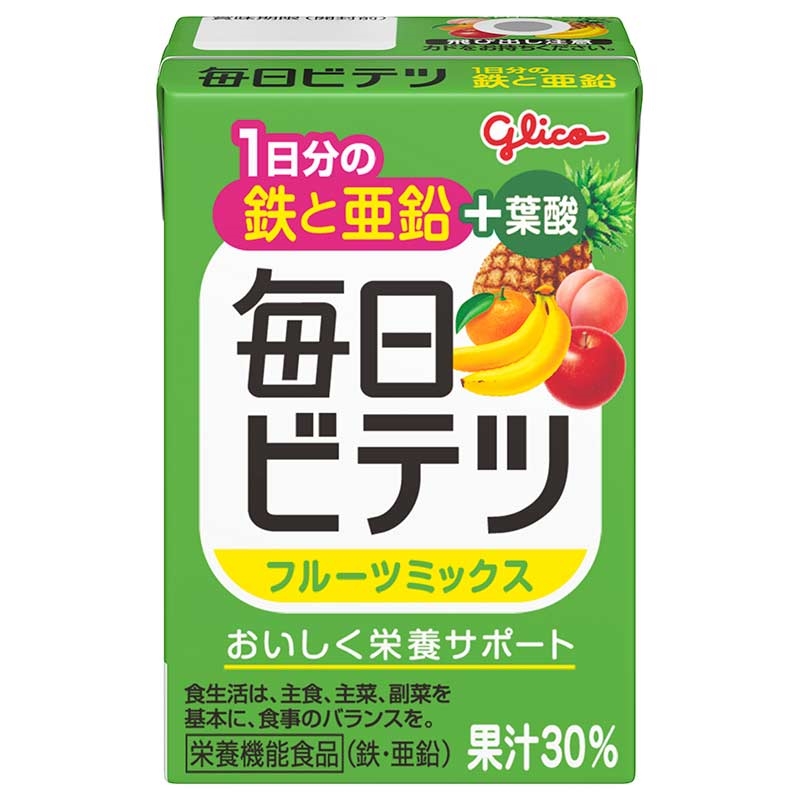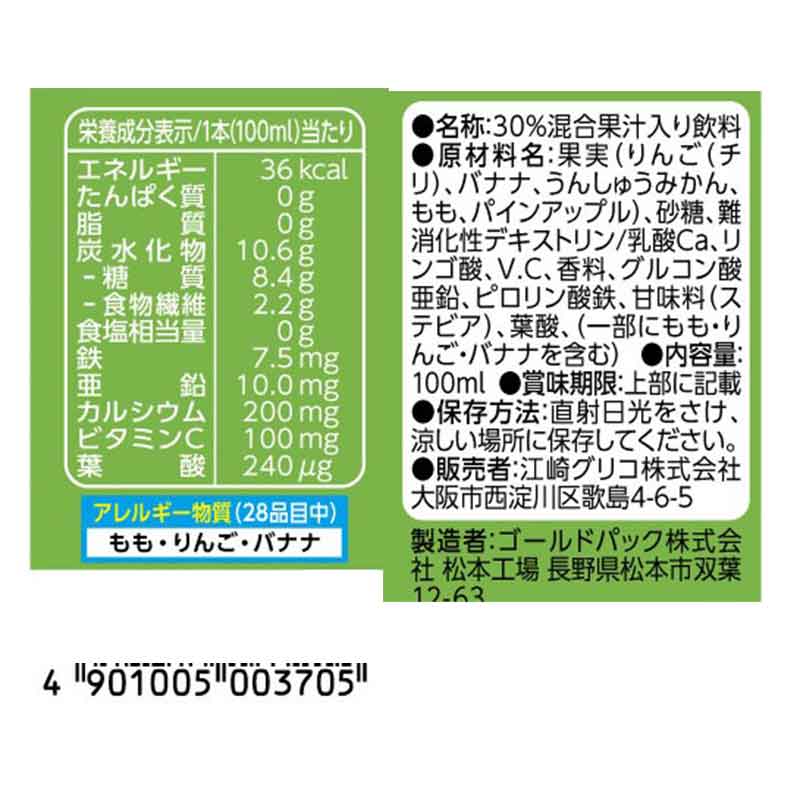 ●30%混合果汁入り飲料 ●原材料名:果実(りんご(チリ)、バナナ、うんしゅうみかん、もも、パインアップル)、砂糖、難消化性デキストリン/乳酸Ca、リンゴ酸、V.C、香料、グルコン酸亜鉛、ピロリン酸鉄、甘味料(ステビア)、葉酸、(一部にもも・りんご・バナナを含む) ●内容量:100ml ●栄養成分:その他 熱量 36kcal たんぱく質 0g 脂質 0g 炭水化物 10.6g ナトリウム -mg 糖質 8.4g 食物繊維 2.2g 鉄 7.5mg 亜鉛 10.0mg カルシウム 200mg ビタミンC 100mg 葉酸 240μg