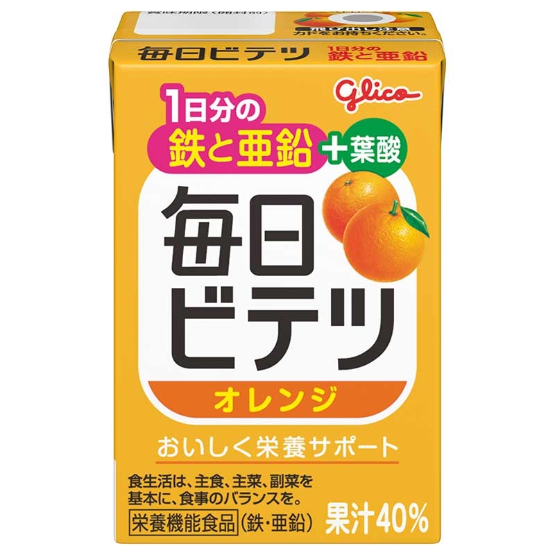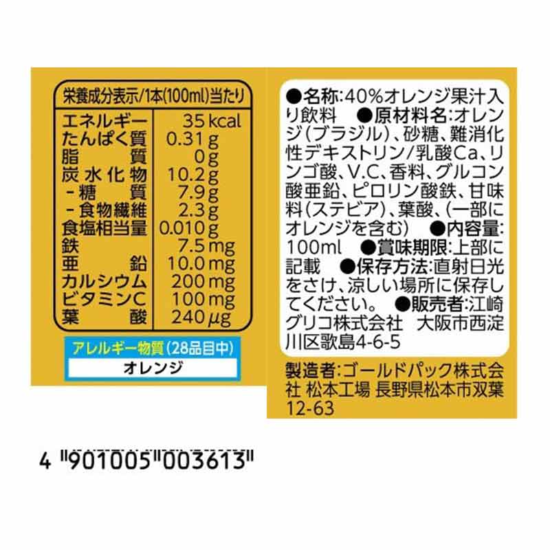 ●40%オレンジ果汁入り飲料 ●原材料名:オレンジ(ブラジル)、砂糖、難消化性デキストリン/乳酸Ca、リンゴ酸、V.C、香料、グルコン酸亜鉛、ピロリン酸鉄、甘味料(ステビア)、葉酸、(一部にオレンジを含む) ●内容量:100ml ●栄養成分:その他 熱量 35kcal たんぱく質 0.31g 脂質 0g 炭水化物 10.2g ナトリウム -mg 糖質 7.9g 食物繊維 2.3g 鉄 7.5mg 亜鉛 10.0mg カルシウム 200mg ビタミンC 100mg 葉酸 240μg