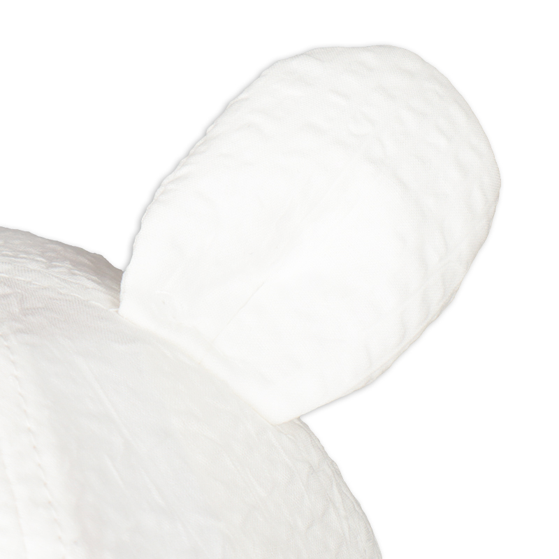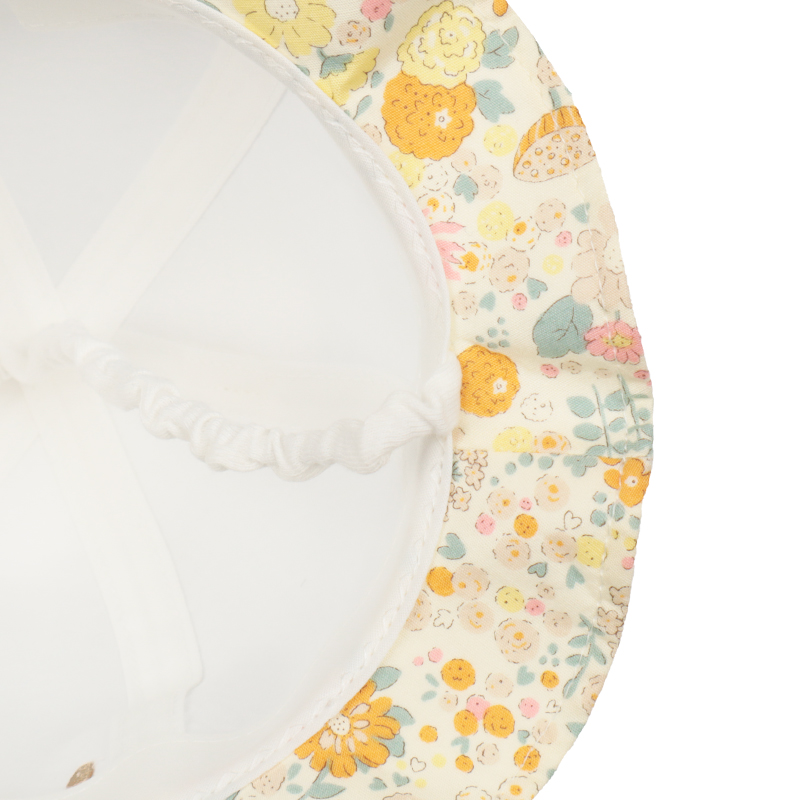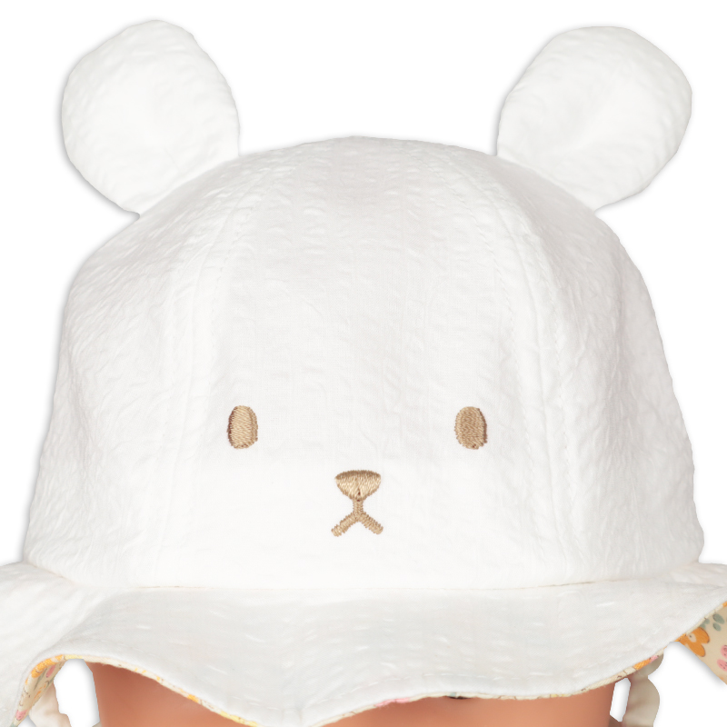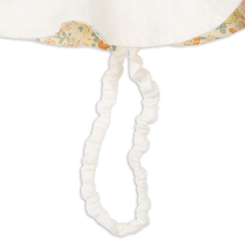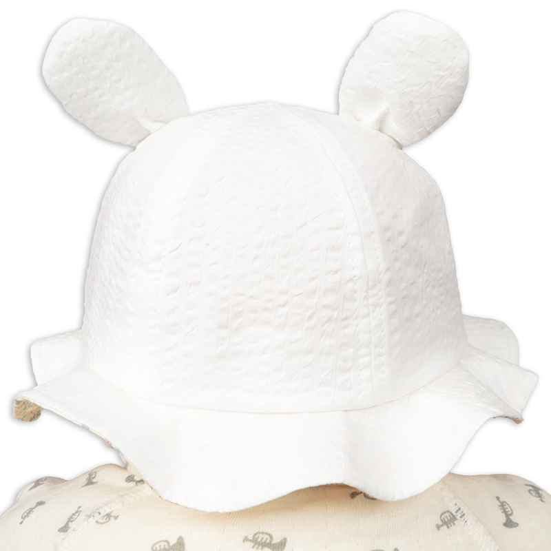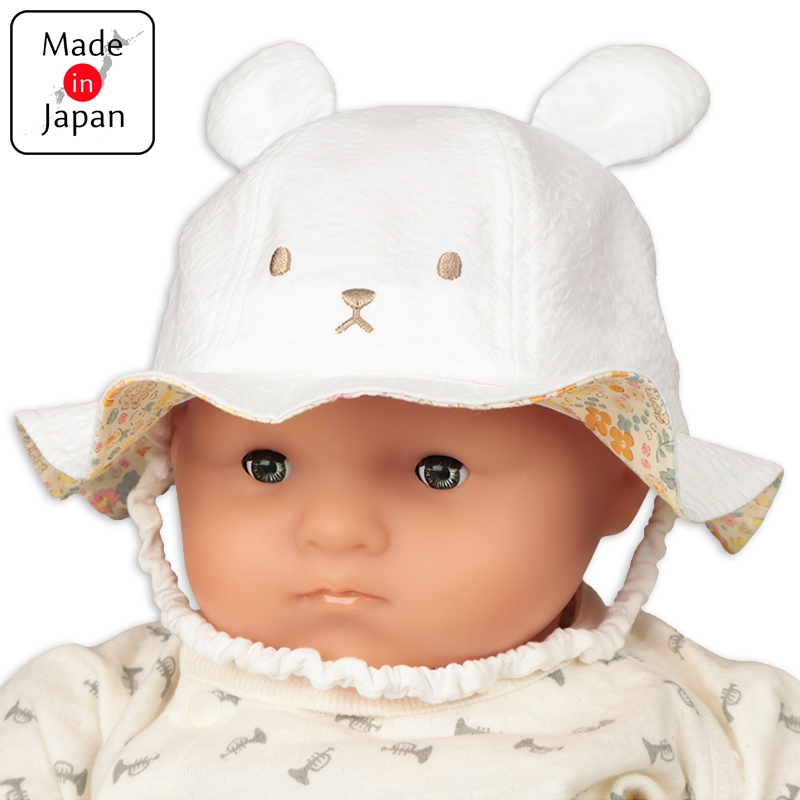 ウサギの耳とフリルのツバがとってもかわいい帽子です。 裏側はパステルカラーの小花柄になっています。 日差しが気になるお外ではUVカットの数値も高いので紫外線対策としてもおすすめです。 あごゴムには赤ちゃんの肌に優しい綿素材でゴムを包んだものを使用しています。 安心の日本製です。