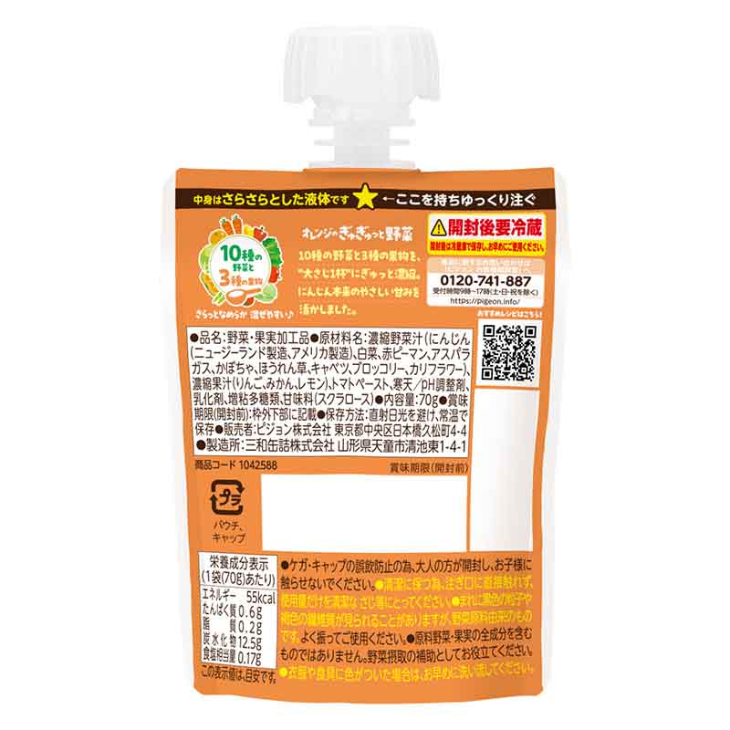 ●原材料名:濃縮野菜汁(にんじん(ニュージーランド製造、アメリカ製造)、白菜、赤ピーマン、アスパラガス、かぼちゃ、ほうれん草、キャベツ、ブロッコリー、カリフラワー)、濃縮果汁(りんご、みかん、レモン)、トマトペースト、寒天/pH調整剤、乳化剤、増粘多糖類、甘味料(スクラロース) ※原材料に含まれるアレルギー物質(28品目中) りんご ●1袋(70g)あたり エネルギー 55kcal たんぱく質 0.6g 脂質 0.2g 炭水化物 12.5g 食塩相当量 0.17g この表示は目安です。 ●ケガ・キャップの誤飲防止の為、大人の方が開封し、お子様に触らせないでください。 ●衣服や食具に色がついた場合は、お早めに洗い流してください。 直射日光を避け、常温で保存 開封後要冷蔵 開封後は冷蔵庫で保存し、お早めにご使用ください。
