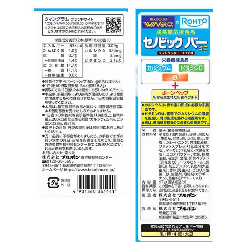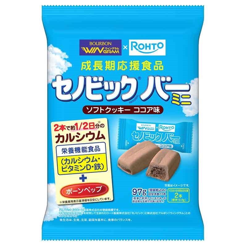 成長期のお子様に大切な栄養素を手軽に摂れる栄養機能食品(カルシウム・ビタミンD・鉄)です。 ミニバータイプのソフトクッキーが1本ずつ個包装されています。 ロート製薬株式会社:セノビックと株式会社ブルボン:ウィングラムとのコラボ商品です。