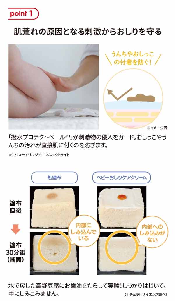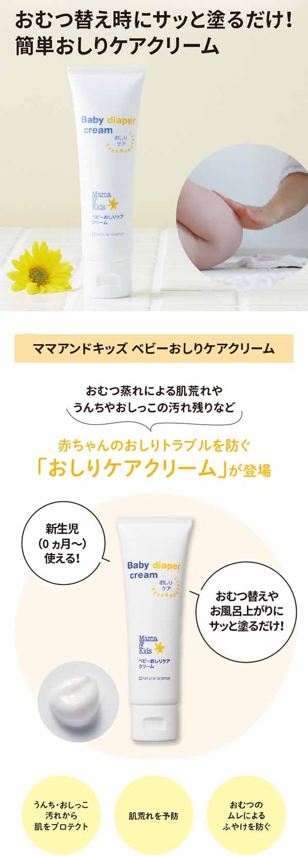 生後0ヵ月の赤ちゃんから使える、デリケートなおしりまわりの肌荒れを防ぐ低刺激クリームです。 撥水バリアベールでうんちやおしっこなどの刺激から肌をガード。 しっかりと肌をバリアしながらも、べたつかずのびが良い使い心地で、蒸れやすいおしりまわりでもさらっと快適に過ごせます。 ご使用方法は適量を手にとり、おしりやおしりまわり、肛門部にやさしくなじませます。 おむつ替えや入浴後などお肌を清潔にした状態でご使用ください。