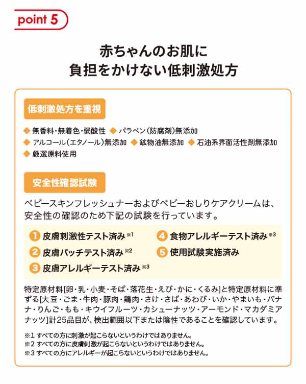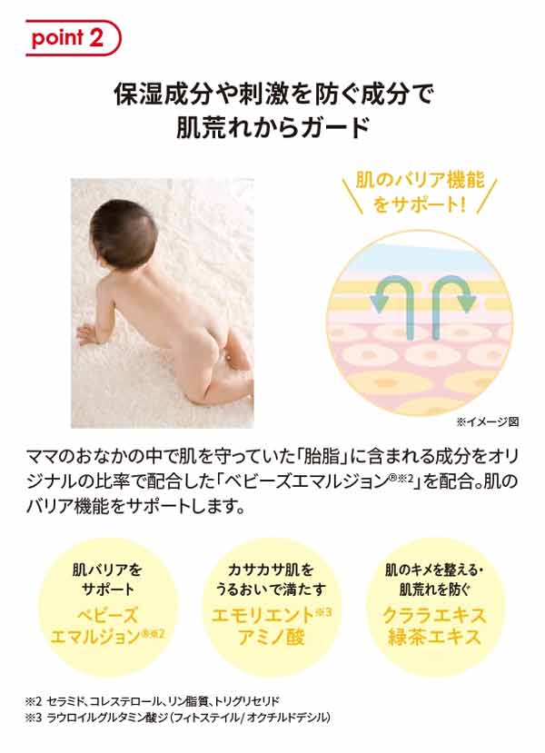 ●容量:53g 成分について ●無香料 ●無着色 ●低刺激性 ●鉱物油無添加 ●パラベン無添加 ●アルコール(エタノール)無添加 ●石油系界面活性剤無添加 ●皮膚アレルギーテスト(RIPT)済み※2 ●敏感肌の方のご協力による皮膚パッチテスト済み※1 ●食物アレルギー(25品目)テスト済み※2※3 ※1 すべての方に合うというわけではございません。 ※2 すべての方にアレルギーが起こらないというわけではありません。 ※3 特定原材料[卵・乳・小麦・そば・落花生・えび・かに・くるみ]と特定原材料に準ずる[大豆・ごま・牛肉・豚肉・鶏肉・さけ・さば・あわび・いか・やまいも・バナナ・りんご・もも・キウイフルーツ・カシューナッツ・アーモンド、マカダミアナッツ]計 25 品目 が、検出範囲以下または陰性であることを確認しています。 主な配合成分 ●ベビーズエマルジョンR(セラミド・コレステロール・リン脂質・トリグリセリド)(保護保湿) ●エモリエントアミノ酸、クララ葉エキス、緑茶エキス(保護・保湿) ●撥水プロテクトベール(保護)