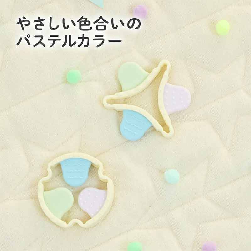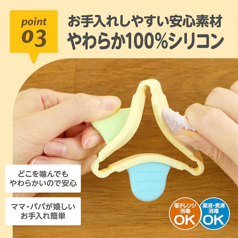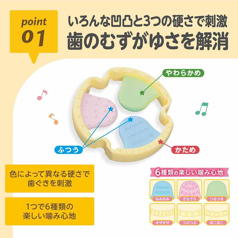 ●お子様の気分に合わせて形を変えて、お気に入りの噛み心地を見つけよう。 ●6種類のデコボコと表面処理で、なめなめからカミカミまで楽しめます。 ●大きくなったら指遊びの練習にも。 ●飽きずに長く遊べる工夫が盛りだくさんの歯がためです。