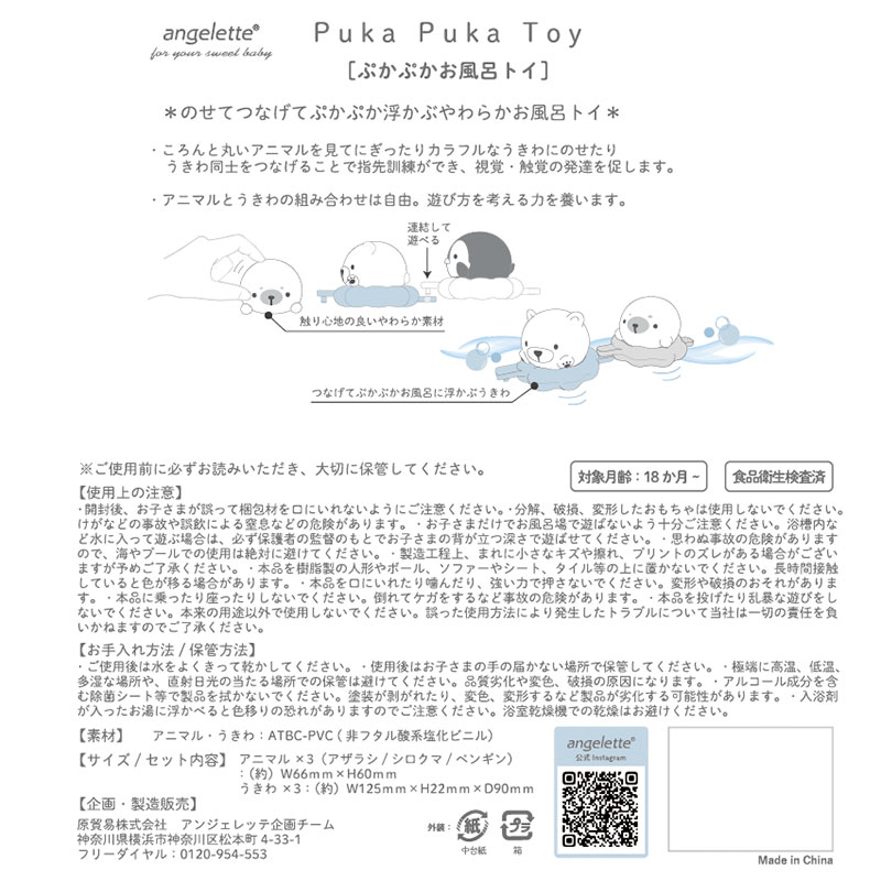 ●対象年齢:18ヵ月~ ●素材:ATBC-PVC(非フタル酸系塩化ビニル) ●サイズ(約・mm): [アニマル]W66×H60 [うきわ]W125×H22×D90 ●セット内容: ・アザラシ×1 ・シロクマ×1 ・ペンギン×1 ・うきわ×3 ・浴室乾燥機を使用する際は浴室から出して保管してください。 ・ご使用後は水けをきって保管してください。 ・取説、お手入れ方法をよく読んでご使用ください。