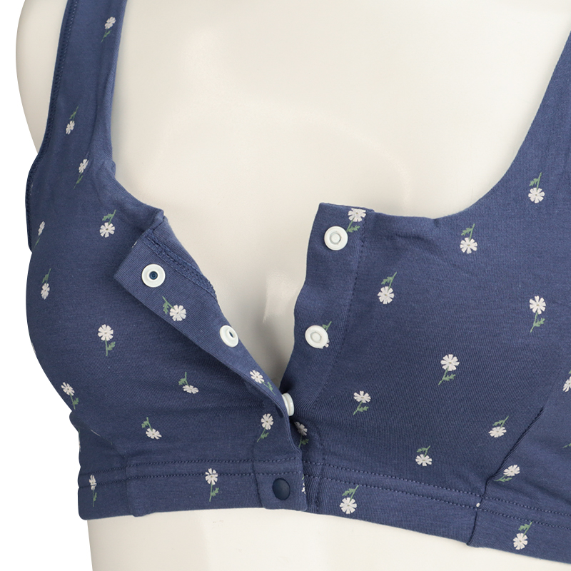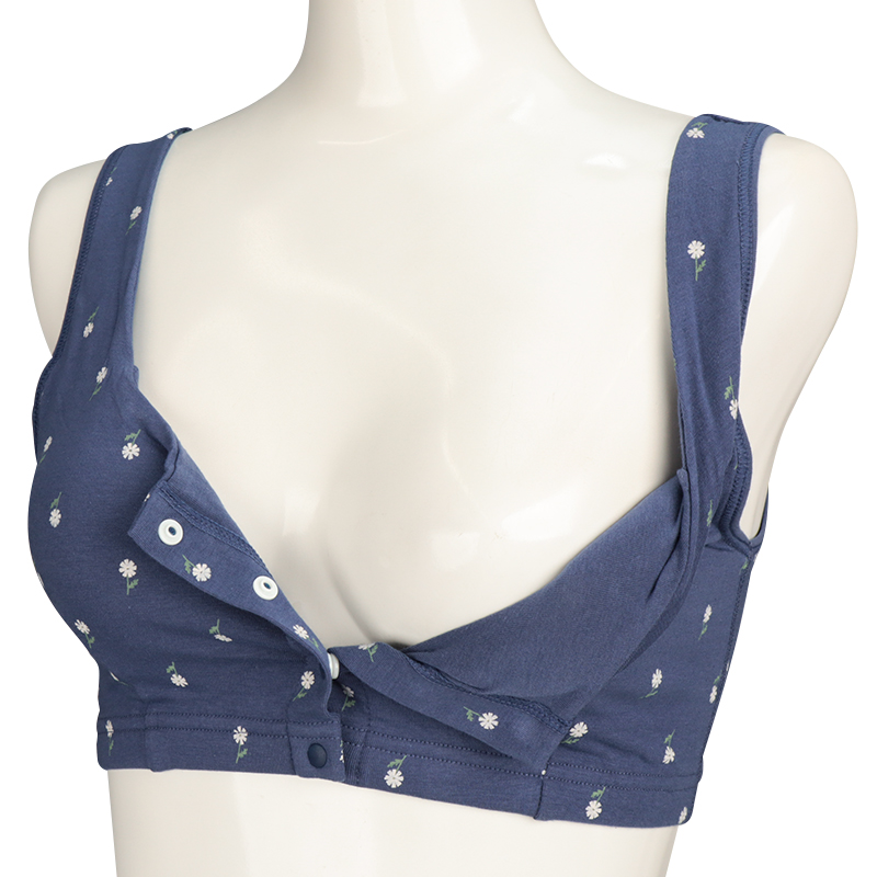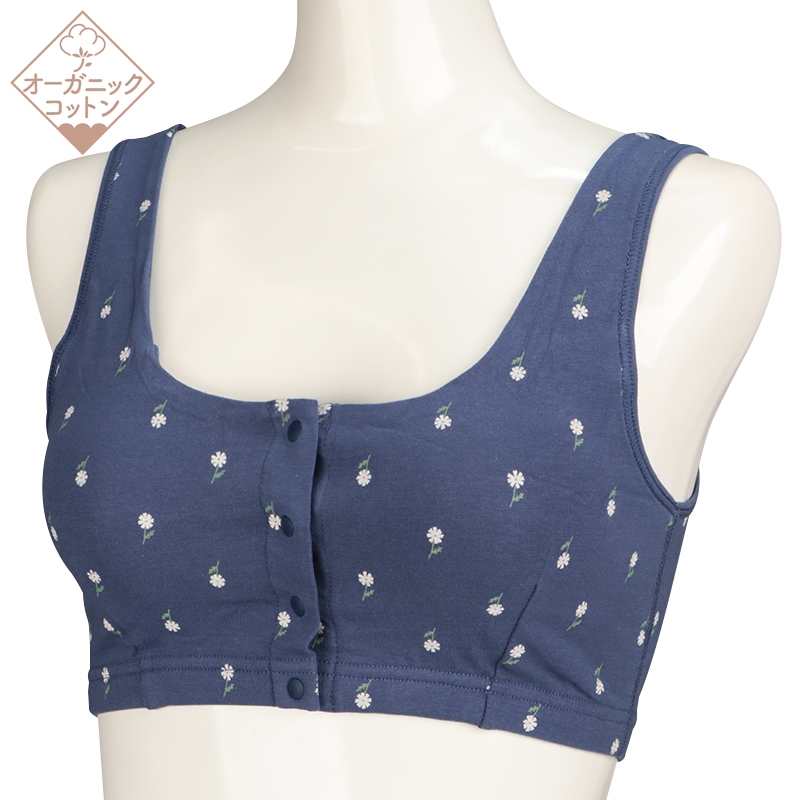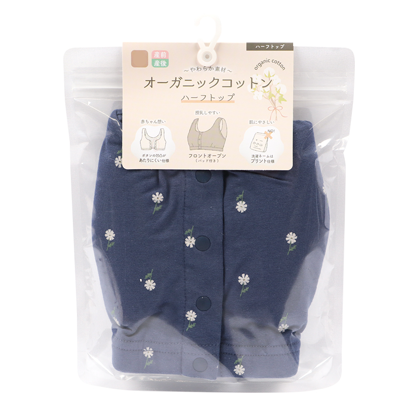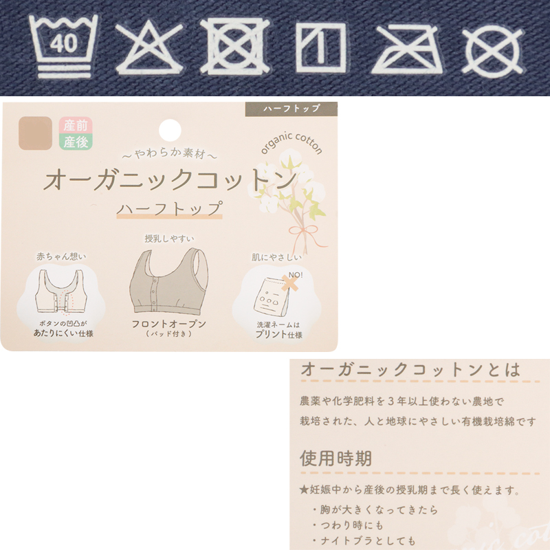 ●素材=綿(オーガニックコットン)95%・ポリウレタン5% ●サイズ=M(バスト86~94cm)、L(バスト93~101cm)、LL(バスト100~108cm) ●フロントオープンタイプ ●取り外し可能なパッド付き ●産前産後