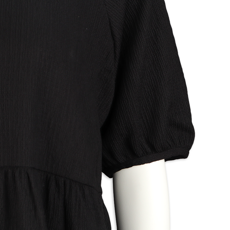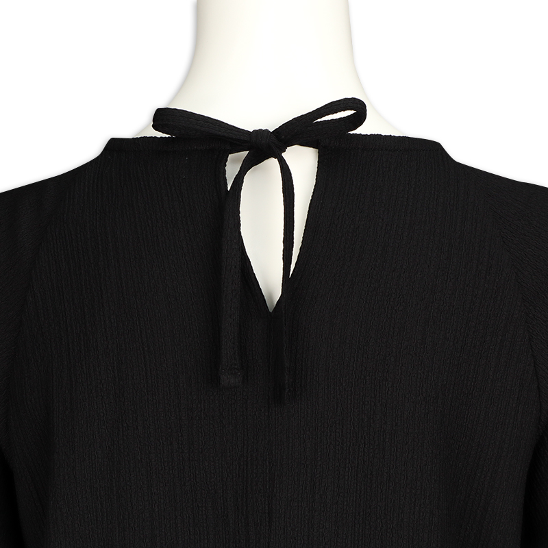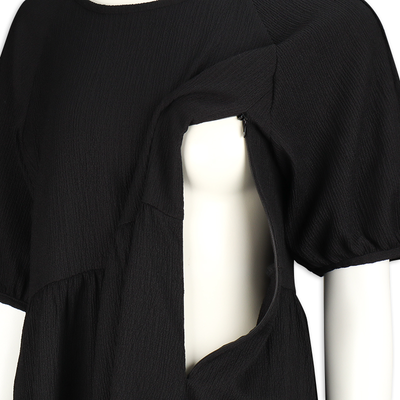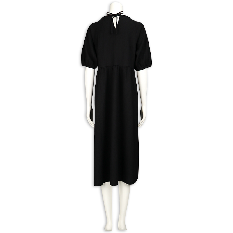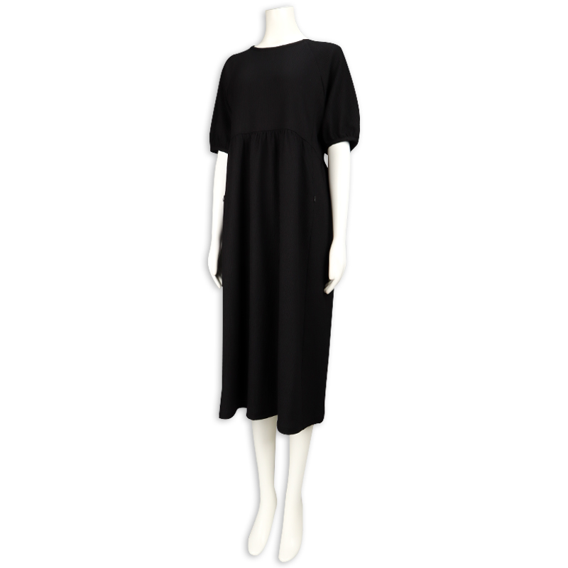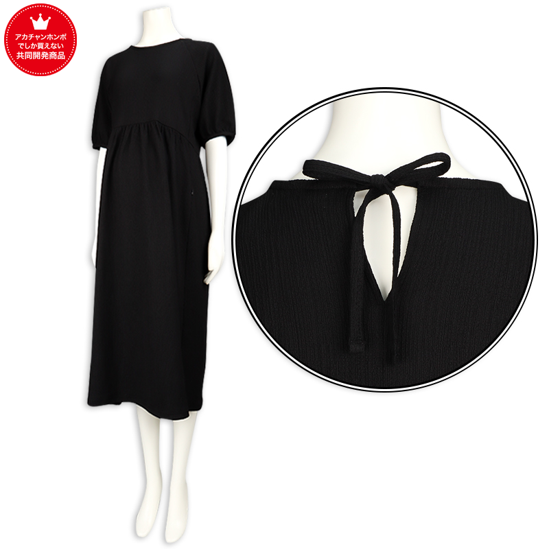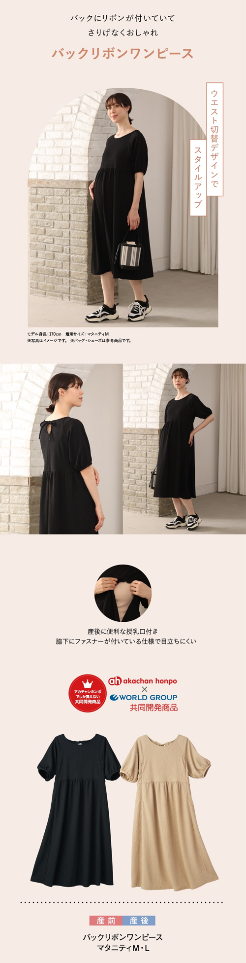 ポコポコとした表面感で体に張り付かないジャージをハイウエスト切替をいれたワンピースにしています。 デザインポイントにバックリボンをプラスしています。 前身頃左右にコンシール明きの授乳口もあり利便性のいいアイテムとしてお勧めです。