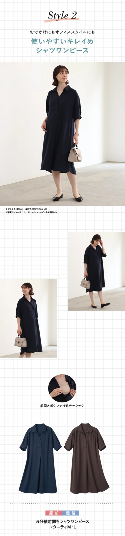 5分袖の前開きシャツワンピースとなります。 素材は、ポリエステル100%の合繊タイプとなります。 前身のボタンを開けると、楽に授乳する事が出来ます。 ボタンはスナップタイプで開けやすいタイプです。 裾のギャザー使いでゆったり着用する事が出来ます。