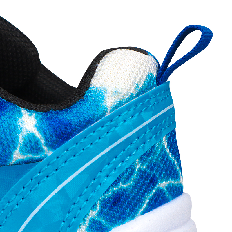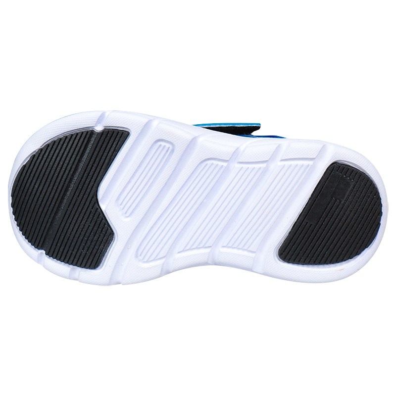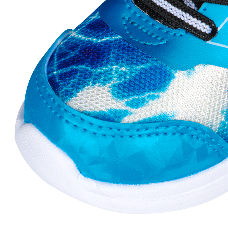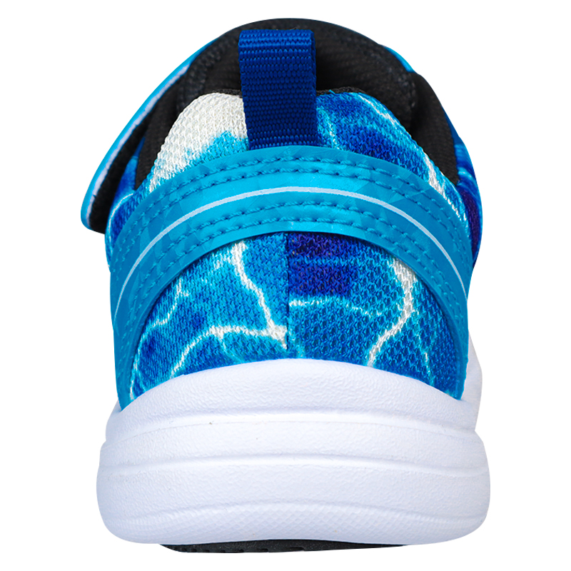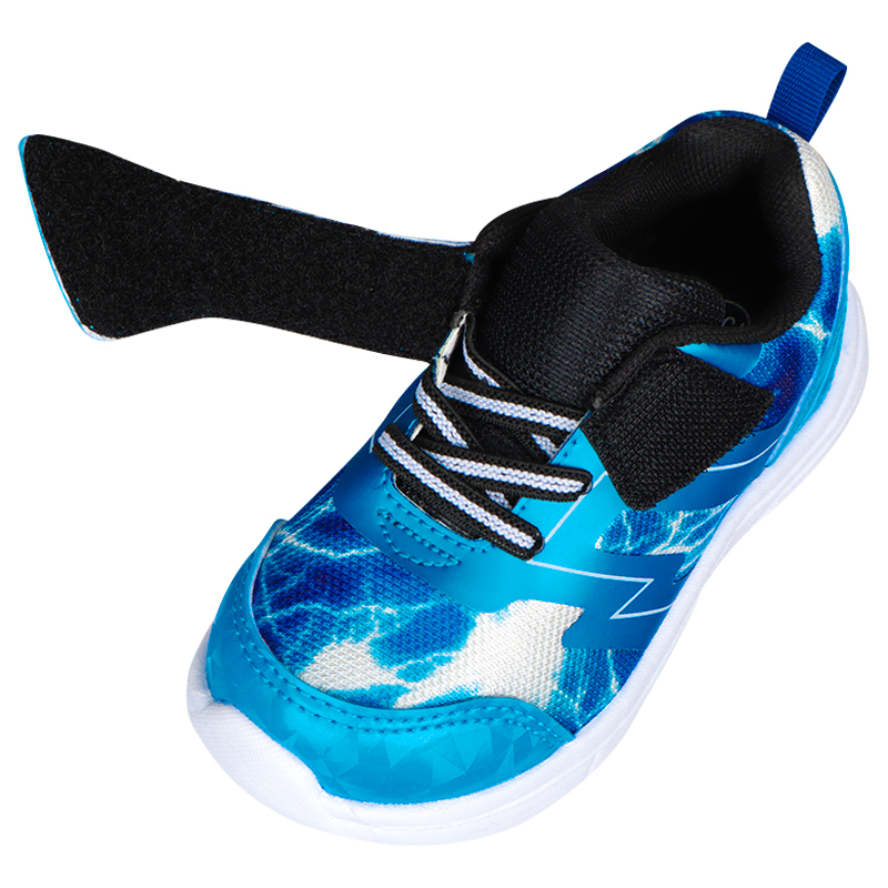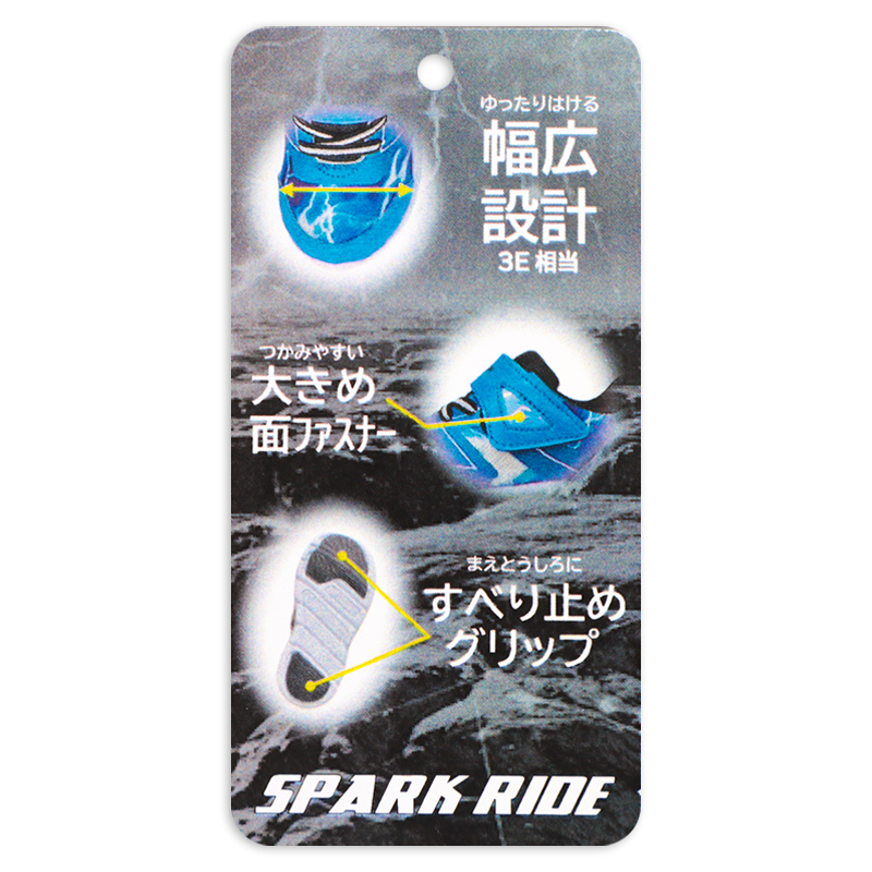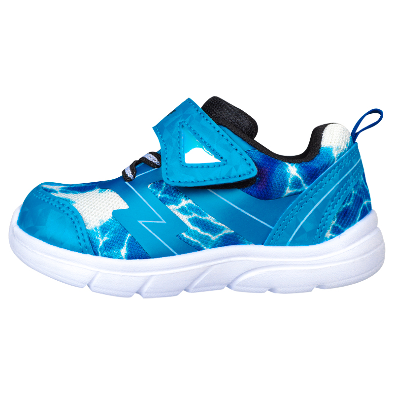 青い稲妻プリントがイチオシのかっこいいシューズアイテム。更にゆったり履ける幅広設計(3E相当)、脱ぎ履きする時に掴みやすい大きめ面ファスナー、靴底の前と後ろにすべり止めグリップなど機能性も充実しています。