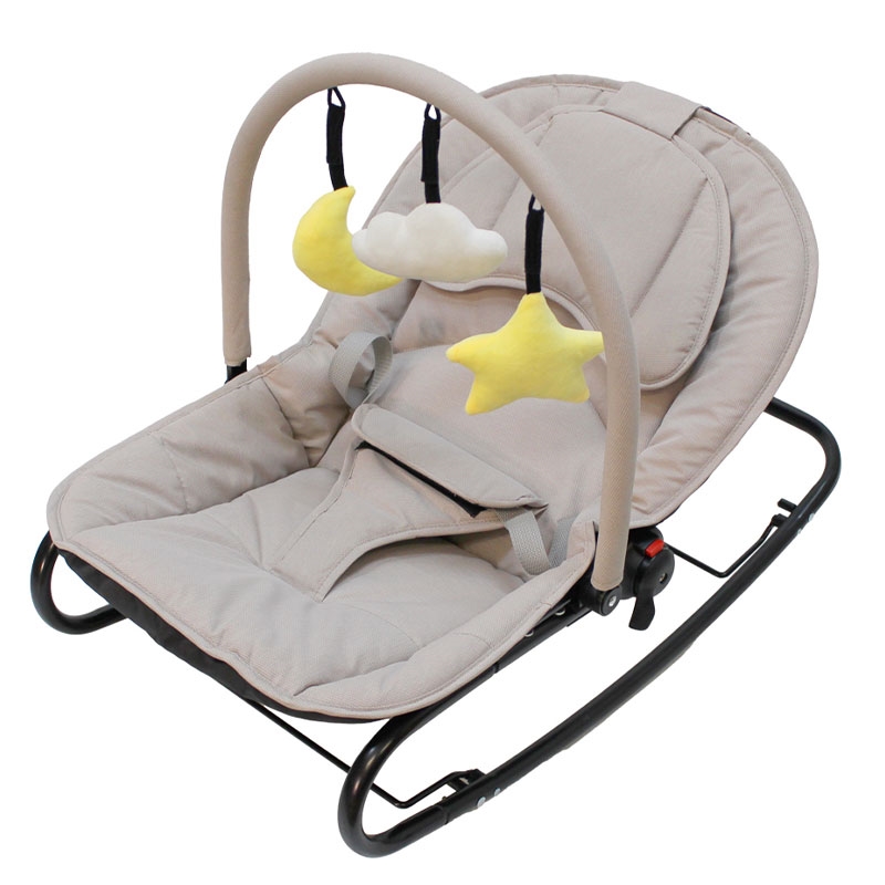 ベッド仕様とチェアー仕様の2WAYで使えるバウンサーです。 お遊び・お昼寝・お食事さまざまなシーンで使用できます。 ・おもちゃバーは角度調整が可能です。 ・おもちゃは取り外し可能で長く使用できます。 ・股ベルト付き。 ・お子様のお好みの角度でリクライニングを調節できます。 ・低月齢時の頭の部分をサポートするヘッドクッション付きです。 ・おもちゃバーには柔らかな星、月、雲のおもちゃが各1個付いています。 振ると鈴の音がなります。