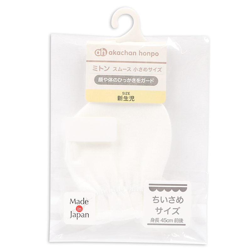 やわらかな肌触りのスムース生地の小さめサイズのミトンです。 赤ちゃんが爪でデリケートなお肌を傷つけないようにやわらかなミトンを 着けてあげることをお勧めします。 赤ちゃんにやさしい綿100%のスムース生地を使用しています。