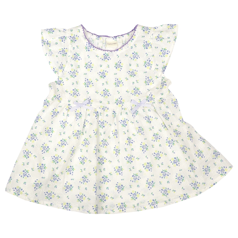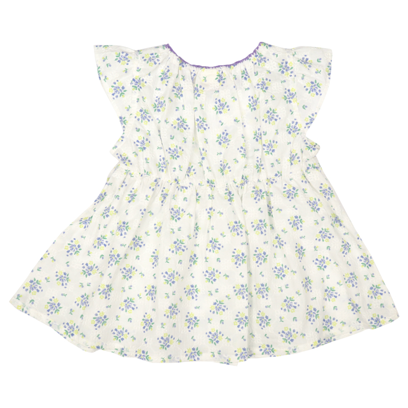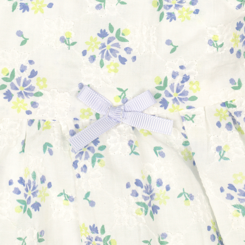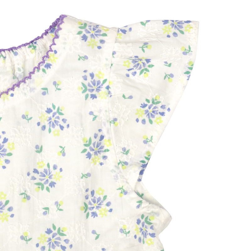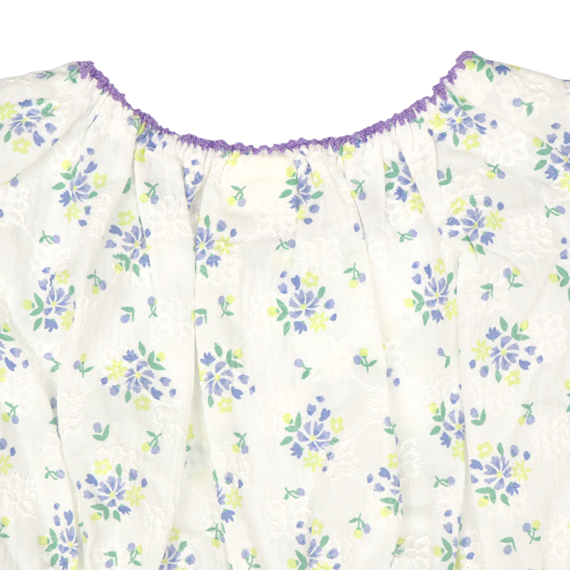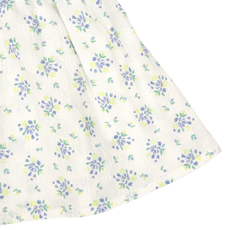 素材 綿100%のブロード、総刺しゅうにオーバープリント 綿100% サイズ100/110/120 身丈 37.5/40.5/43.5 身巾 30/32/34 裾巾 61/65/69 フリル丈 5.5/5.5/5.5