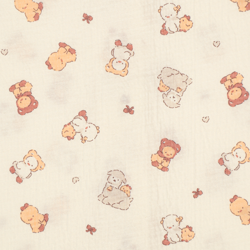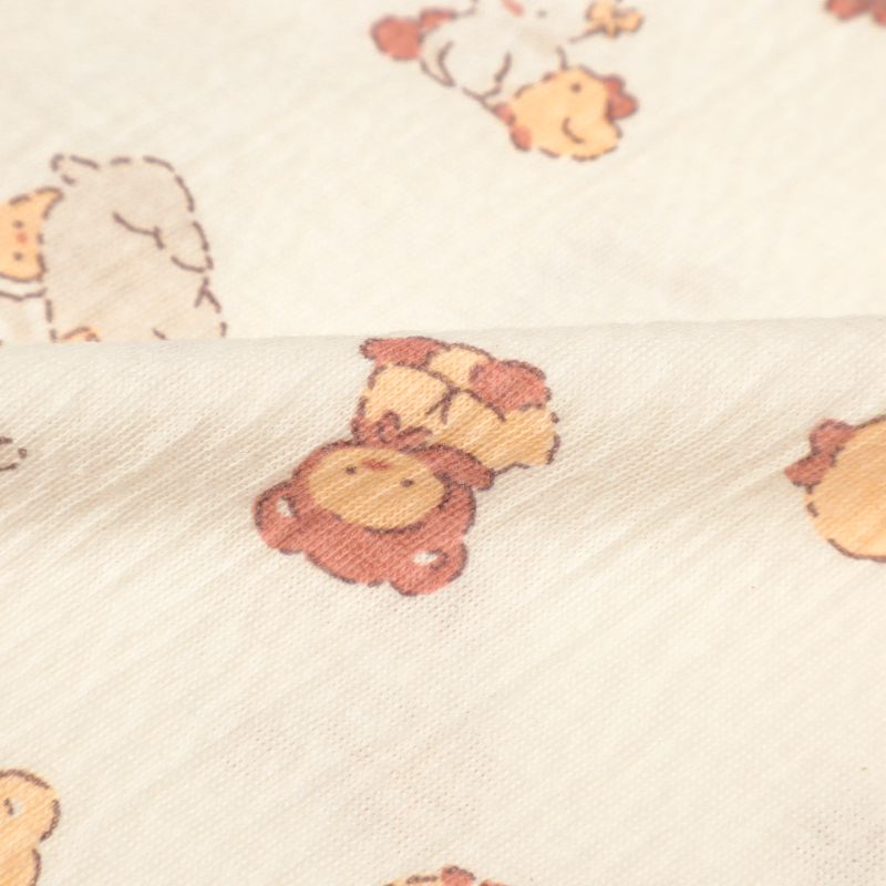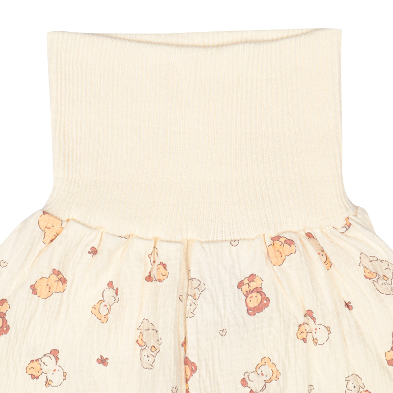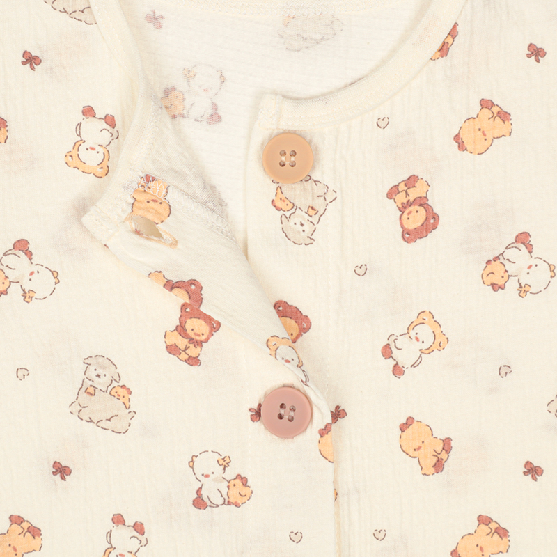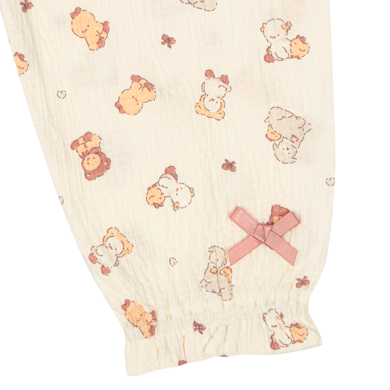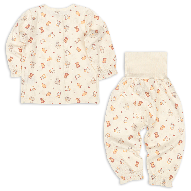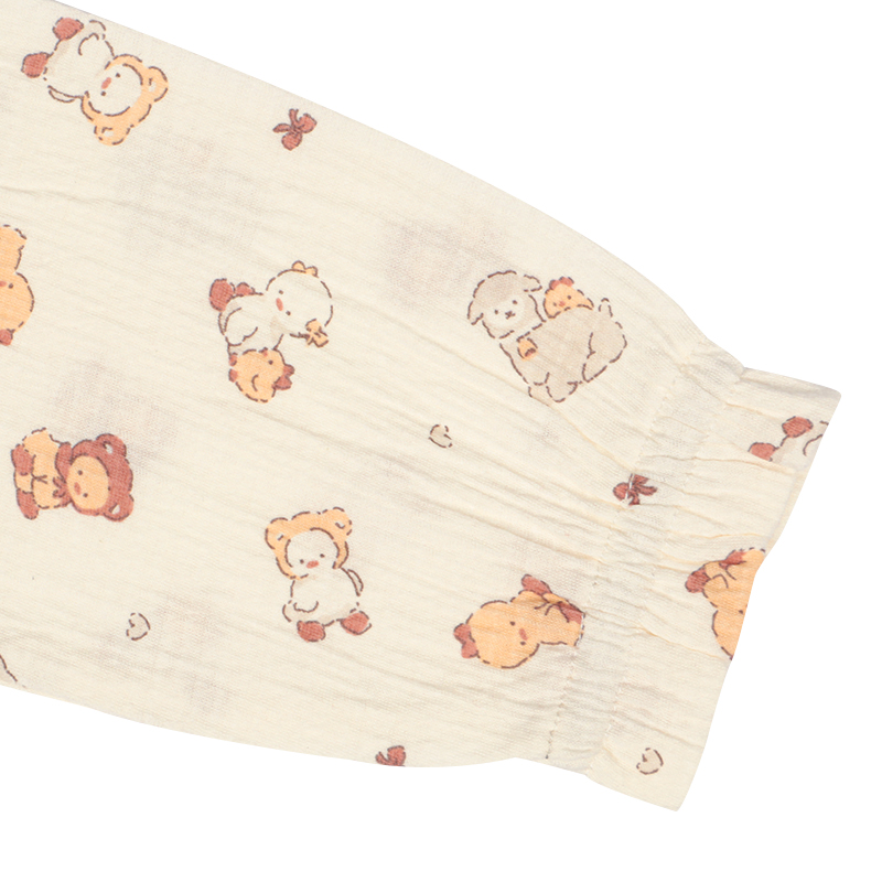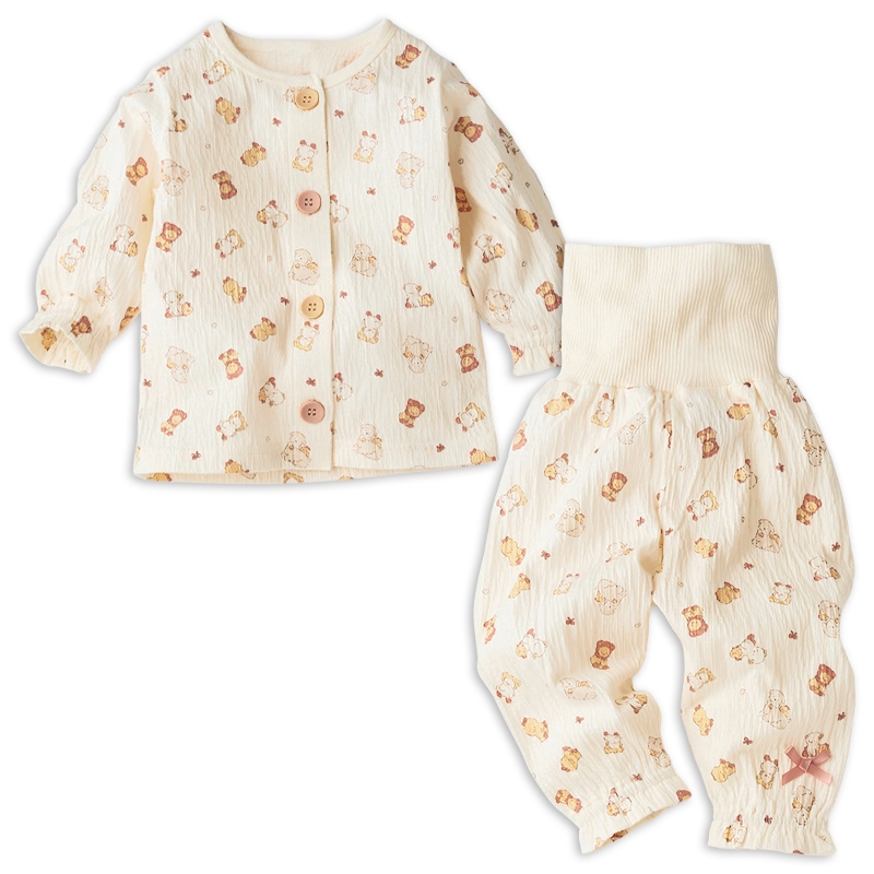 ベビー女児用、秋向けお着替え応援パジャマのご提案です。 素材は伸縮性があって着心地が良い、シャーリング天竺です。 トップスは、釦の色とホールの色を合わせて掛け違いを防ぎます。 ボトムは裾部分にワンポイントを入れており、どちらが前が分かるようになっています。 また、お腹が出にくい深い股上設計と優しい腹巻き付きなどこだわりが詰まった商品になっています。 オフシロ地にアニマルの総柄です。