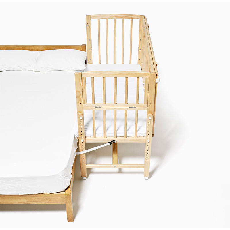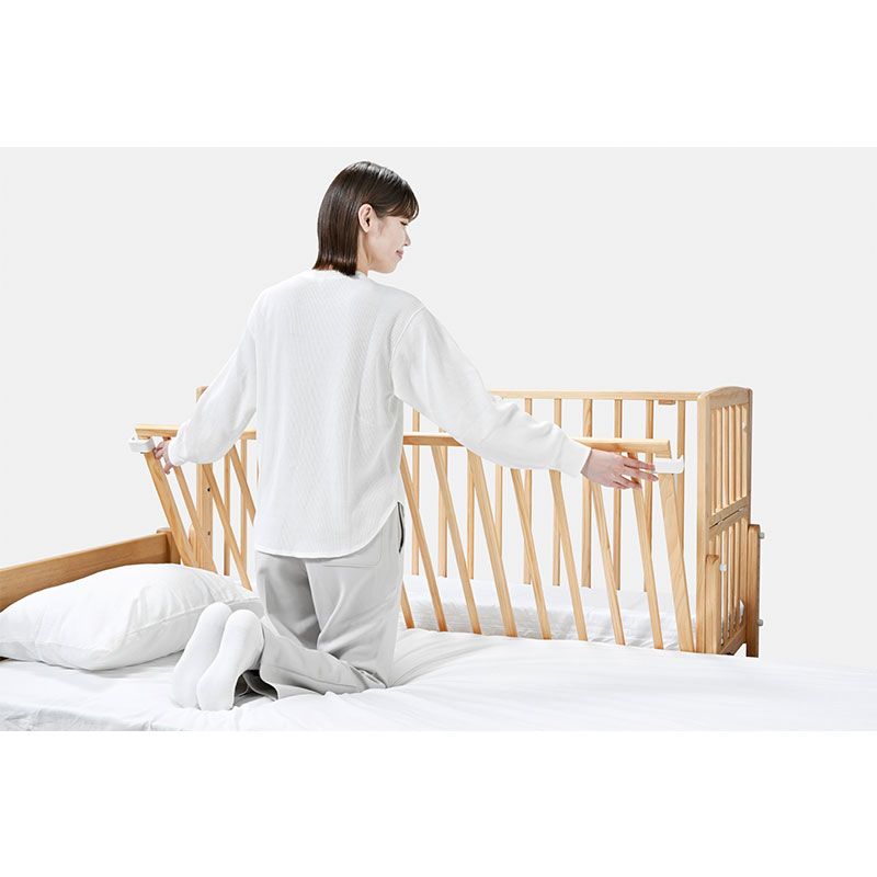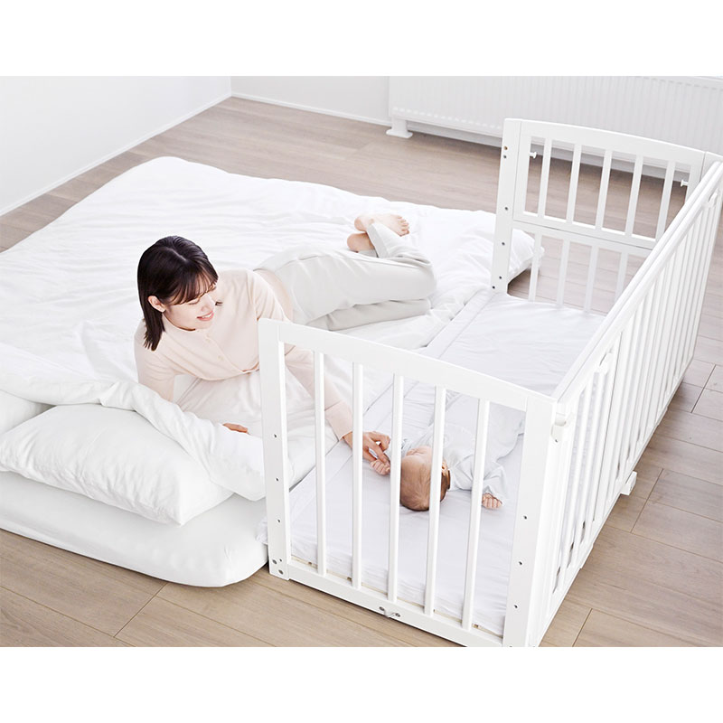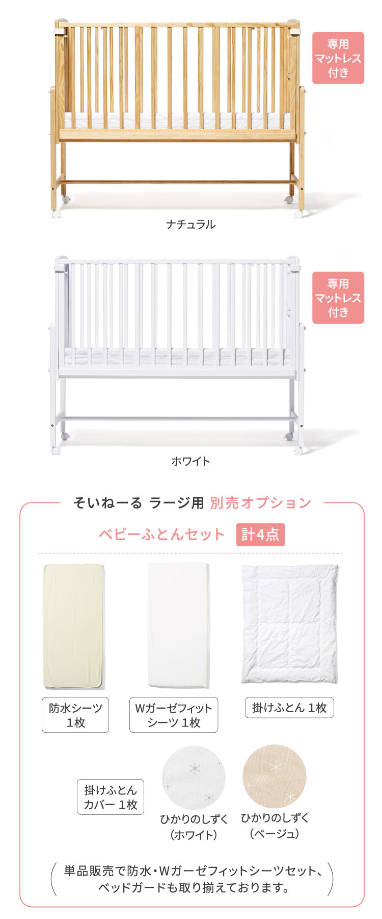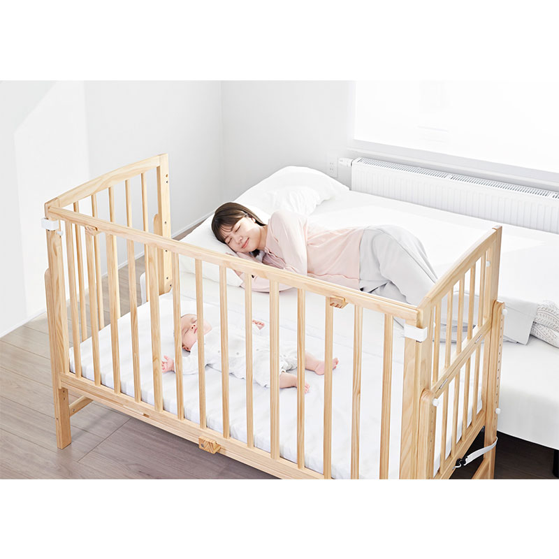親子の近さは、よりよい眠りを生み出す。 そいねーるラージは6歳くらいまで一緒に使えるベッドです。 一つのベッドで一緒に寝るよりも気楽で、別々で寝るよりも安心。 親子が一緒に寝られるわずかな期間をより素敵な時間にして欲しい。 お子様は、ママのにおい、寝息を感じて安心して眠る。 ママは、お子様の寝顔を見ながら癒される。 そんな添い寝ができるベビーベッド。 大人のベッドの高さと合わせ、段差なくつなげて使用可能。 6歳頃まで使用可能。専用マットレス付き。 本体はナチュラルとホワイトの2色展開。