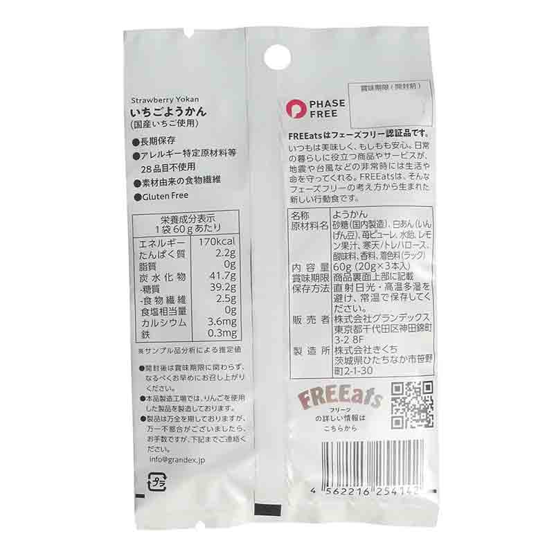 国産いちご使用 長期保存 アレルギー特定原材料28品目不使用。 着色料・香料不使用。 素材由来の食物繊維 GlutenFree/ForVegan FREEatsはフェーズフリー認証品です。 みんなにうれしい行動食