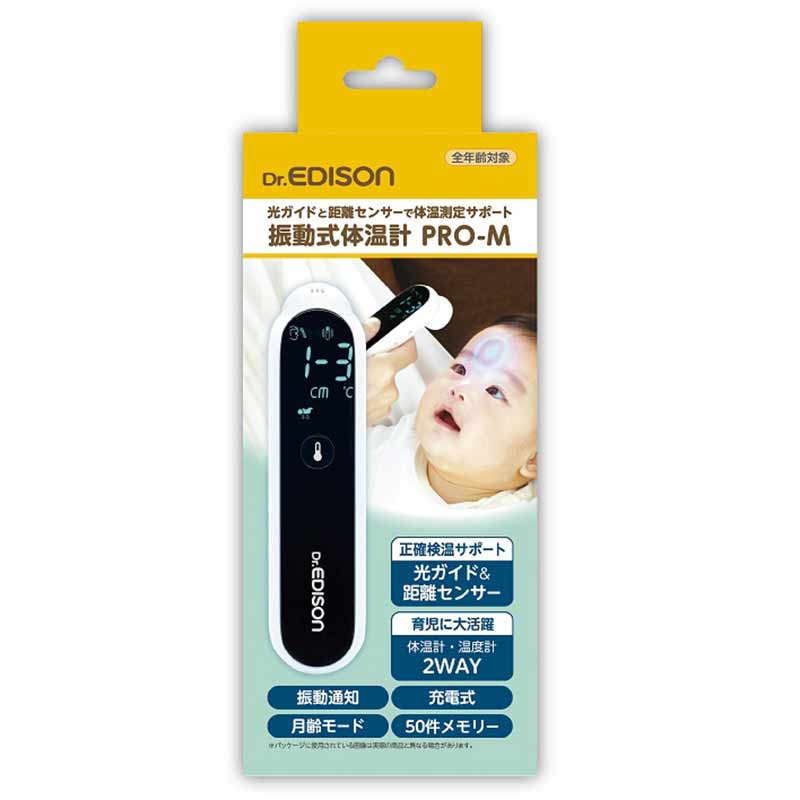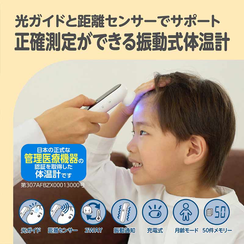 ●販売名称:皮膚赤外線体温計 振動式体温計PRO-M ●一般名称:皮膚赤外線体温計 ●医療機器分類:管理医療機器 ●測定温度範囲:体温計モード:35.0~43.0℃)、温度計モード:0.0~100.0℃ ●サイズ:W37×D38×H151mm ●重量:76g ●電源:リチウムイオン電池(DC3.7V、500mAh) ●付属品:専用充電ケーブル、取扱説明書(保証書)、医療機器添付文書