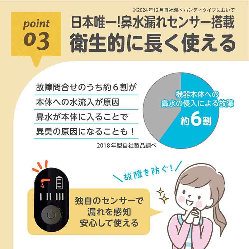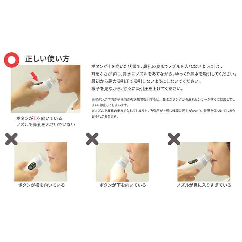 ●管理医療機器 認証番号:第303AFBZX00056000号 ●吸引圧:-70kpa ●電源:リチウムポリマー電池DC3.7V ●充電時間:約60分で満充電(5V/2A) ●セット内容: 本体、充電ケーブル、通常ノズル、コンパクトノズル ●付属品:取扱説明書/品質保証書、医療機器添付文書 ※ご注意:連続使用時間は1分です。1分を経過すると自動で電源がOFFになります。
