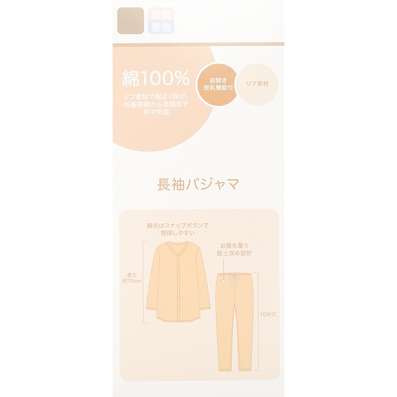 綿100%のテレコリブ素材の長袖パジャマとなっております。 リブ素材なので、楽に伸びます。 前身のボタンを開けて、授乳するタイプです。 パンツのウエスト部分には、ゴムとひもが通っております。 ひもで、サイズ調節が可能です。