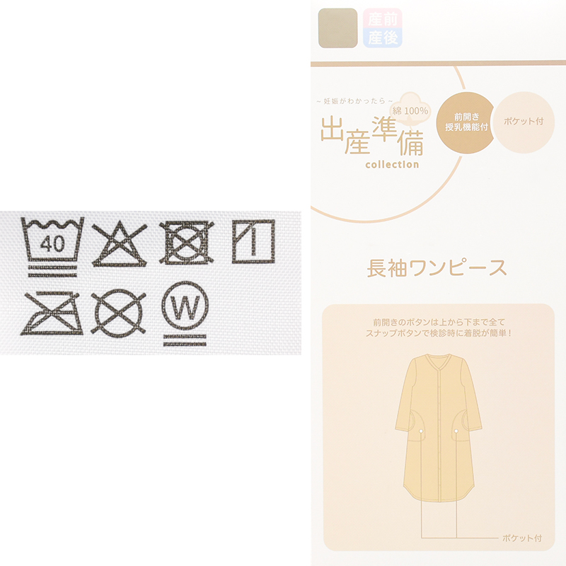 ●素材=綿 100% ●洗濯表示=液温は40℃を限度とし洗濯機で非常に弱い操作での洗濯ができる。漂白処理はできない。タンブル乾燥禁止。日陰でのつり干しがよい。アイロン仕上げ処理はできない。ドライクリーニングはできない。非常に弱い処理でのウエットクリーニングができる。 ●サイズスペック=[MーL]身巾 47.8 着丈 110 肩線 36.2 袖丈 57 袖口巾 11 裾巾 64.6 [LーLL]身巾 50.8 着丈 115 肩線 37.7 袖丈 58.5 袖口巾 11.5 裾巾 68.3 ●対象期間=産前~産後