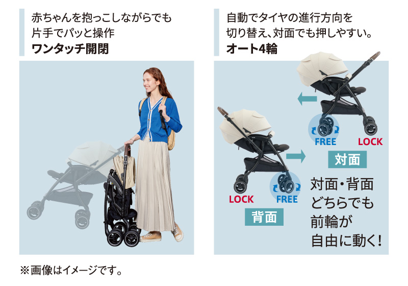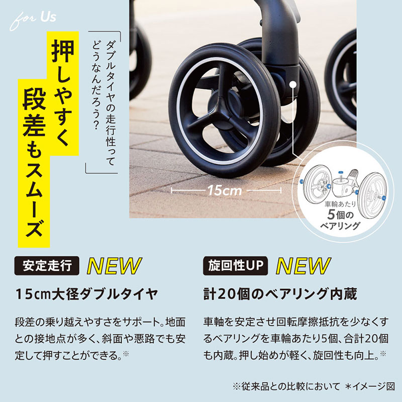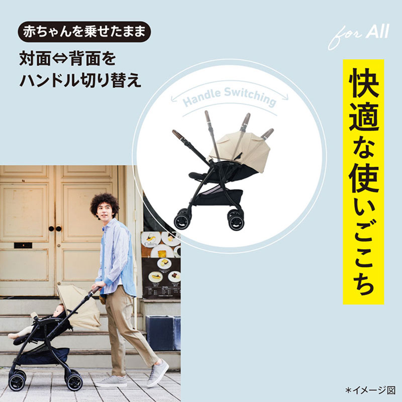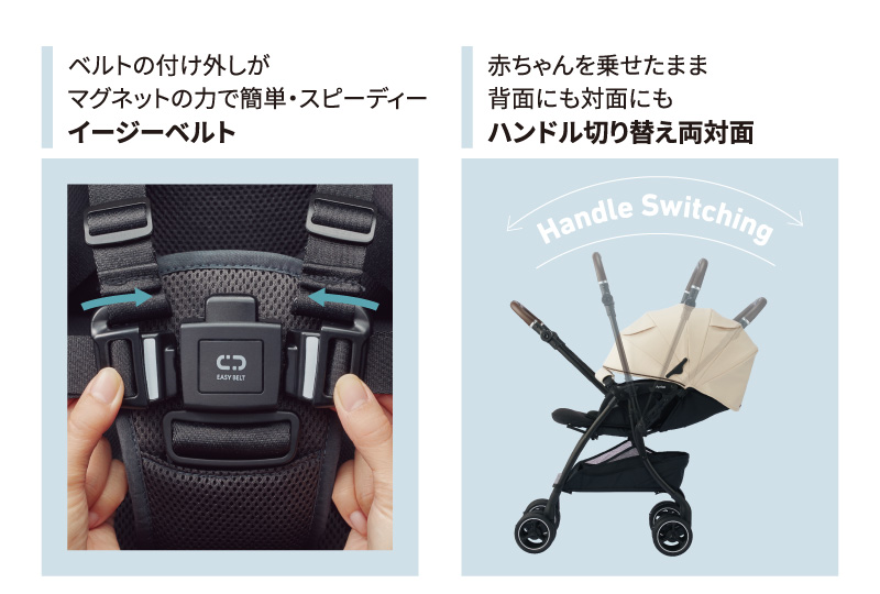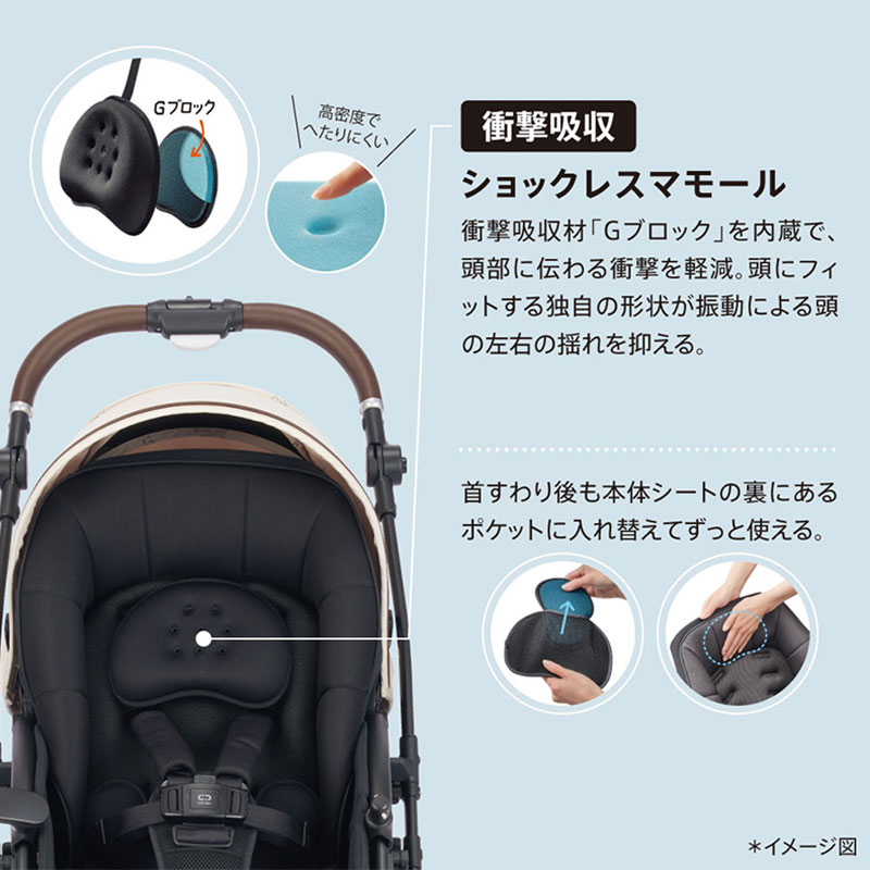 \ゴキゲンつづく、おでかけを。/ 《オメガクッション》 座面の下にソファーのスプリングのようなクッションを搭載。 揺れに応じて座面がやさしく上下し振動を吸収。 《ショックレスマモール》 高性能の衝撃吸収材(Gブロック)を内蔵した ヘッドパッドで赤ちゃんの頭と首をしっかり守ります。 ※Gブロックは首すわり後も本体シートの裏にある ポケットに入れ替えてずっと使用可能。 《ラクーナビッテの限定機能》 ハンドルの角度を調整できる、[マルチハンドル]。 本体シートの上にもう一枚メッシュシート[エアーシート]を搭載。 《進化したダブルタイヤ》 15cmの大型タイヤで段差の乗り越えやすさをサポート。 車軸を安定させ回転摩擦抵抗を少なくするベアリングを車輪あたり5個。 合計20個も内蔵し、押し始めが軽く、旋回性も向上。 《フィットリクライニング》 赤ちゃんの様子を見ながら、ベストポジションに片手で簡単リクライニングが可能 《Wサーモメディカルシステム》 背もたれに設置された通気口が風を通し、 反射板が路面の反射熱を跳ね返して座席の温度上昇を防ぎます。 《振動吸収設計》 フレームのつなぎ目をがっちり溶接して、 剛性を高めたがっちりフレームで車体のぐらつきを抑え、 タイヤに搭載されたやわらかサスペンションで振動を軽減。 《イージーベルト》 ベルトの付け外しがマグネットの力でパット簡単。 《シルキーエアー搭載シート》 メッシュ生地を使用したベースシート・通気性とクッション性を両立した [シルキーエアー]を使用した本体シートに、 赤ちゃん本舗で販売のフリープラスのみ[エアーシート]を搭載。