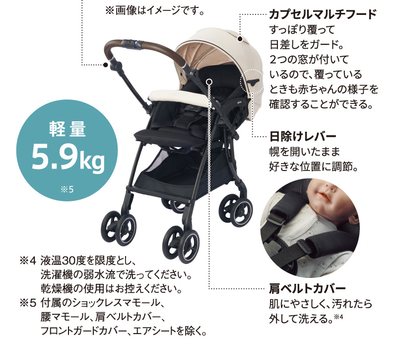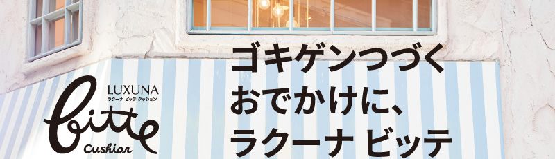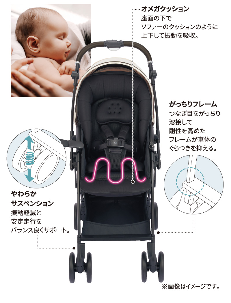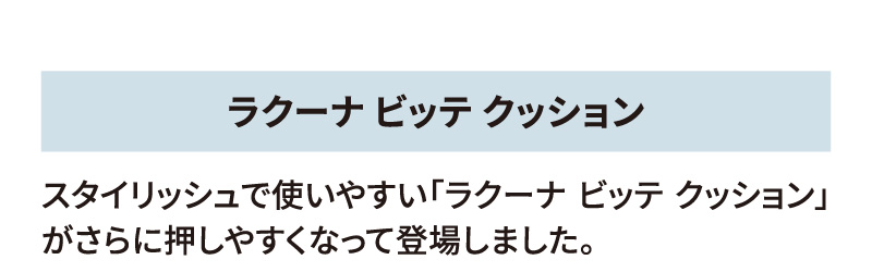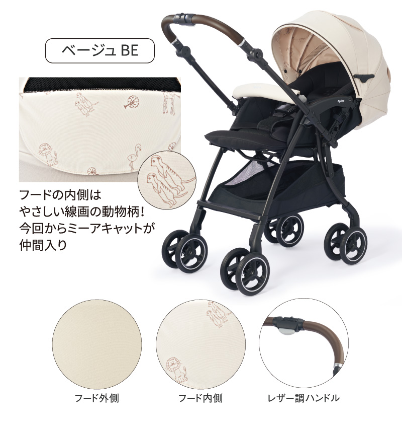 ゴキゲンつづくおでかけに、ラクーナ ビッテ クッション ラクーナ ビッテ クッションが押しやすくなって登場 ラクーナ ビッテ クッション スタイリッシュで使いやすい「ラクーナ ビッテ クッション」がさらに押しやすくなって登場しました。 LUXUNA Bitte Cushion (ラクーナ ビッテ クッション) ラクーナ ビッテ クッション のイメージ1 ラクーナ ビッテ クッション のイメージ2 Love Happy time! ラクーナ ビッテ クッション のイメージ3 point1 ダブルタイヤがリニューアル押しやすく、段差もスムーズに! ベアリングが内蔵された大径ダブルタイヤで安定性はそのまま、押しやすく段差の乗り越えもぐっと良くなりました。 斜面でも悪路でも 15cmの大径ダブルタイヤで斜面でも悪路でも押しやすい。 計20個のベアリングで押し始めが軽く、旋回性も向上! point2 繊細な赤ちゃんを振動・衝撃から守る 「オメガクッション」&「ショックレスマモール」 OMEGACushion オメガクッション まだ繊細な赤ちゃんのからだを、振動から守るこだわりの構造体。 オメガクッション・がっちりフレーム・やわらかサスペンションのイメージ画像です ShocklessMAMORU ショックレスマモール 高性能の衝撃吸収材を内蔵したこだわりのヘッドパッドで赤ちゃんの頭と首を守ります。 独自シェイプ・Gブロック内蔵のイメージ画像です point3 通気性がよく、日差しを防ぐ仕様で真夏のおでかけにも活躍 風を通して熱をカット Wサーモメディカルシステム 通気性がよく丸洗いできる トリプルメッシュシート すっぽり覆って日差しを防ぐ カプセルマルチフード+ 地面からの熱を遠ざける ハイシート point4 他にもおでかけを快適にするスマートな機能がいっぱい! 片手で簡単 フィットリクライニング マルチハンドル ハンドル角度を9段階に調節できる。 カプセルマルチフード 日除けレバー 肩ベルトカバー 軽量5.9kg ベルトの付け外しがマグネットの力で簡単・スピーディー[イージーベルト] 赤ちゃんを乗せたまま背面にも対面にも[ハンドル切り替え両対面] 赤ちゃんを抱っこしながらでも片手でパッと操作[ワンタッチ開閉] 自動でタイヤの進行方向を切り替え、対面でも押しやすい。[オート4輪] 街になじむ2つのカラーラインナップ ベージュ BE フードの内側はやさしい線画の動物柄!今回からミーアキャットが仲間入り ブラック BK マットなブラックにブラウンのハンドルでスタイリッシュな中でも温かみのあるデザイン