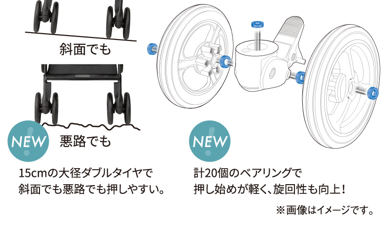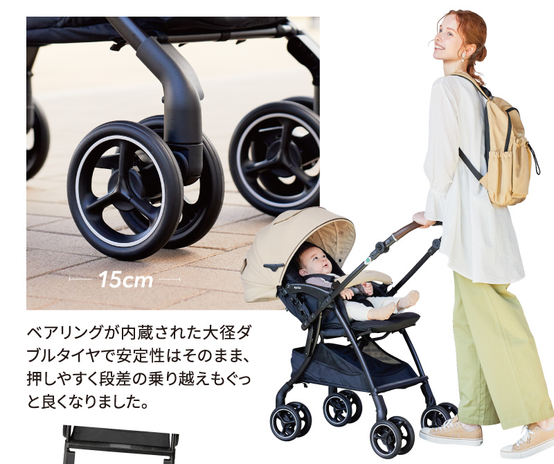15cmの大型タイヤで段差の乗り越えやすさをサポート。