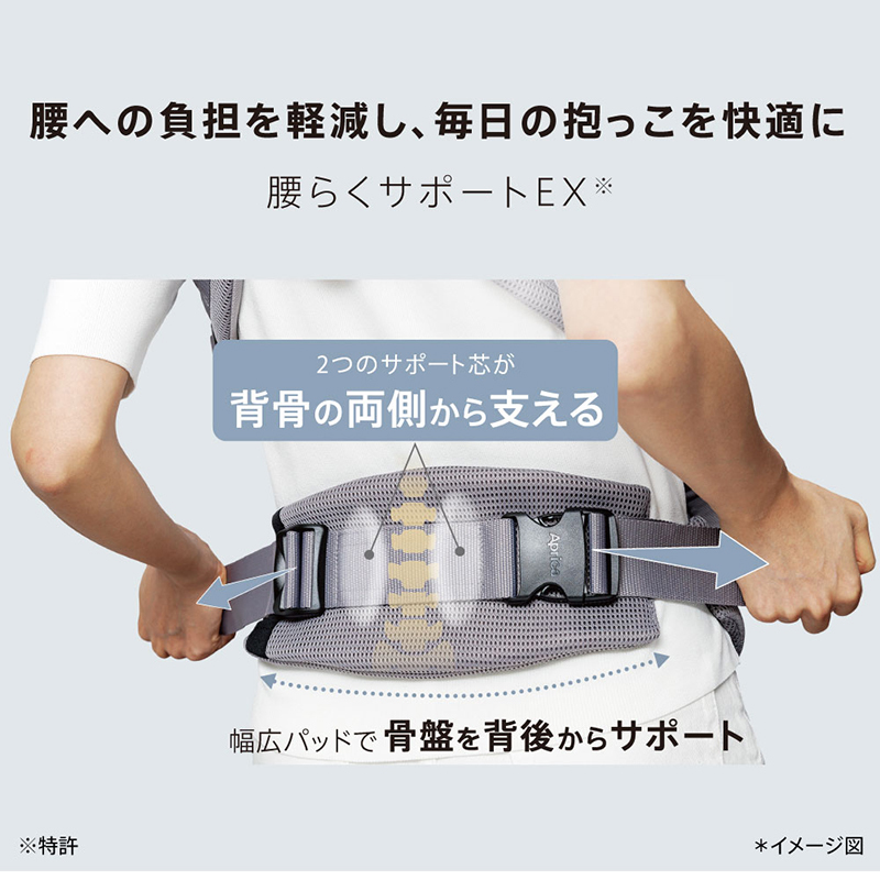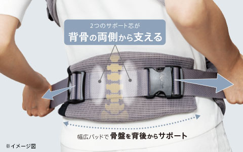 腰らくサポートEXは、2つのサポート芯が背骨を両側から支え、幅広パッドで骨盤を背後からしっかりサポート。抱っこによる腰への負担を軽減します。
