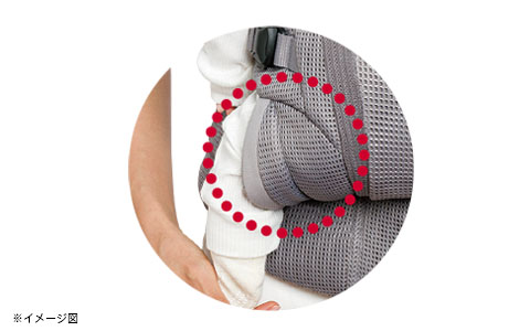 タテ対面抱っこの時、赤ちゃんの足が自然なM字脚姿勢になるようにしっかり支えます。(特許)