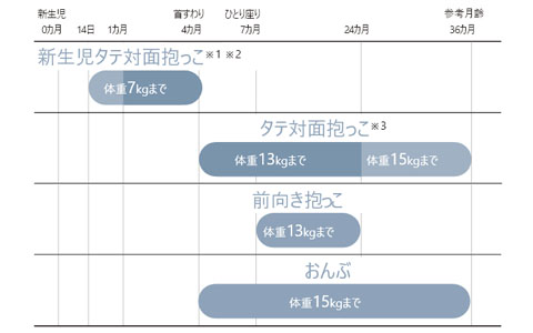 ●対象月齢:生後14日以降かつ体重3.2kg~36ヵ月(体重15kgまで) ●使用期間: [新生児タテ対面抱っこ]生後14日以降かつ3.2kg以上~4ヵ月(体重7kgまで)、ただし首がすわるまで [タテ対面抱っこ]首がすわって(4ヵ月)~36ヵ月(体重15kgまで) [前向き抱っこ]ひとり座りができて(7ヵ月)~24ヵ月(体重13kg)まで [おんぶ]首がすわって(4ヵ月)~36ヵ月(体重153kg)まで ※タテ対面抱っこの生後14日以降1ヵ月まで、24ヵ月を超えてから36ヵ月までは SGマーク制度対象外です。(PL保険対応) ●製品サイズ(約・mm): [本体]<背あての幅>W325×<背あての長さ>H490~597(※ヘッドサポートを起こした状態) [首マモール]W185×H95 [ハイポジションシート]W220(最大部分)×H187(タテ幅) ●製品重量:[本体]838g [首マモール]19g [ハイポジションシート]53g ●製品付属重量:[おやすみカーテン・よだれパッド1組]71g ●パッケージサイズ(約・mm):W220×D180×H310 ●腰ベルトのサイズ(約・mm):600~1,380 ※パパ、ママ兼用。身長や体型によって装着できない場合があります。 ●梱包内容:本体・ハイポジションシート・首マモール・おやすみカーテン・よだれパッド・取扱説明書 ●素材:[表地]ポリエステル100% [裏地]ポリエステル100% ●洗濯: 本体・ハイポジションシート・おやすみカーテン・よだれパッドは洗濯機洗い可能です。 (※洗濯ネット使用、ねじり又は絞り禁止) 首マモールに関しては手洗い可能です。