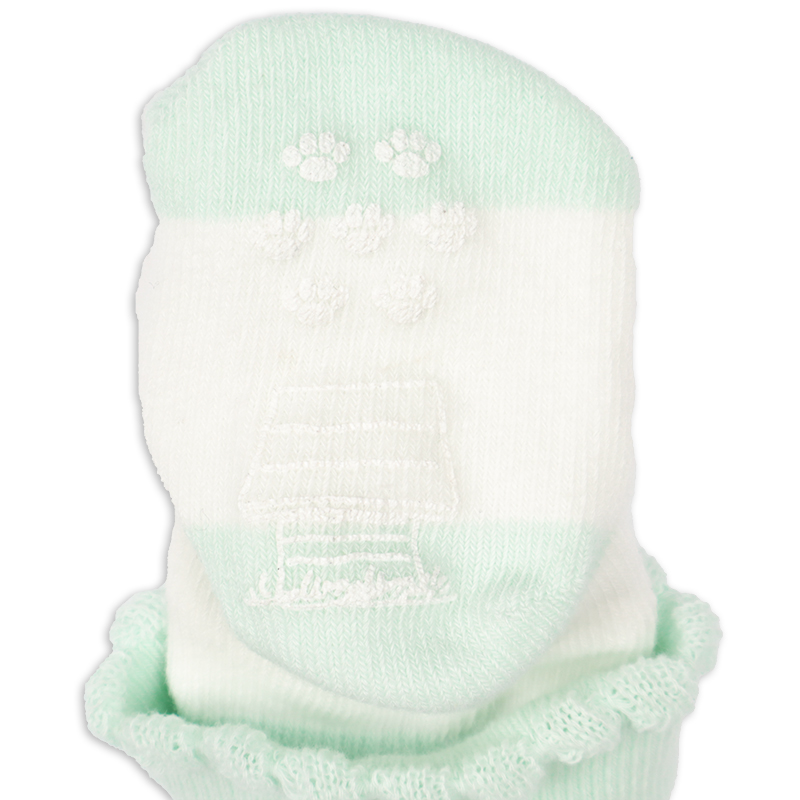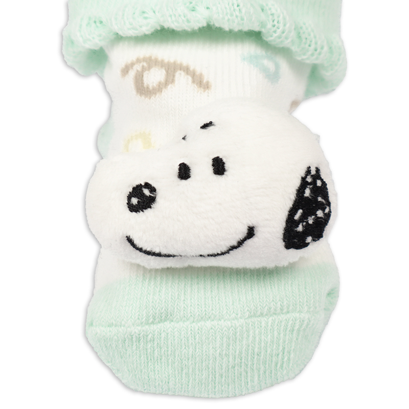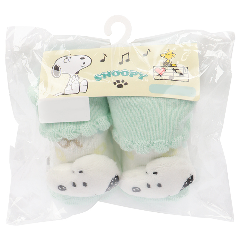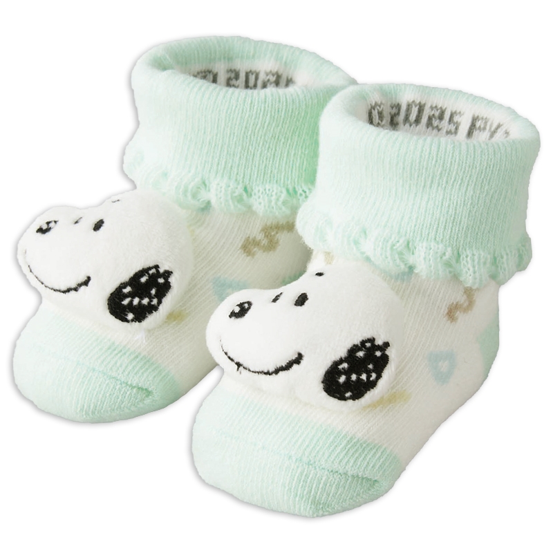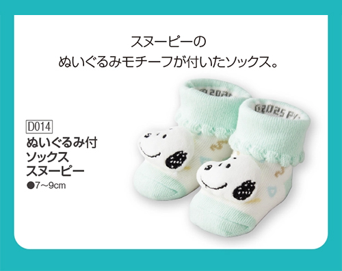 スヌーピーのお顔のぬいぐるみが正面に付いた新生児用のソックスです。 足元がとてもかわいらしいデザインです。 7~9cmの新生児用サイズなので、出産祝い用のギフトとしてもおすすめ。 生まれたての赤ちゃんの小さな足を、可愛らしいソックスで保護します。 足底には滑り止め付き。