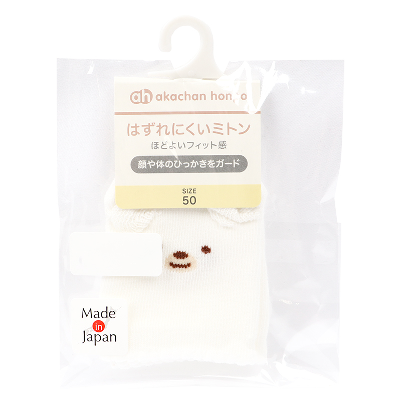 赤ちゃんが顔や身体を爪でひっかいて傷つくのを防ぎます。 立体のかわいい両耳がポイントとなったしろくま柄です。 大きすぎず、新生児の赤ちゃんにちょうど良いサイズでフィットするため、はずれにくい仕様となっております。
