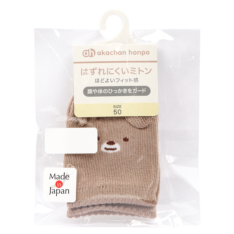 赤ちゃんが顔や身体を爪でひっかいて傷つくのを防ぎます。 立体のかわいい両耳がポイントとなったくま柄です。 大きすぎず、新生児の赤ちゃんにちょうど良いサイズでフィットするため、はずれにくい仕様となっております。