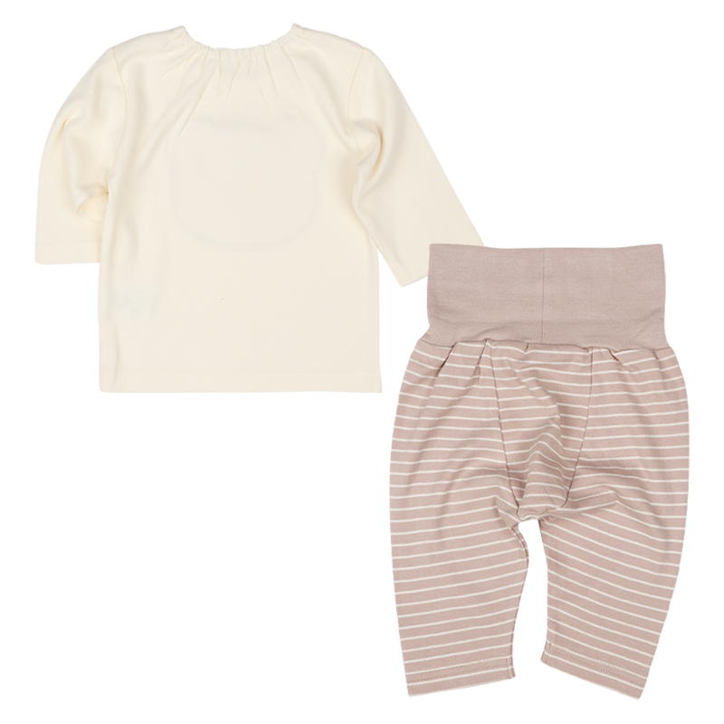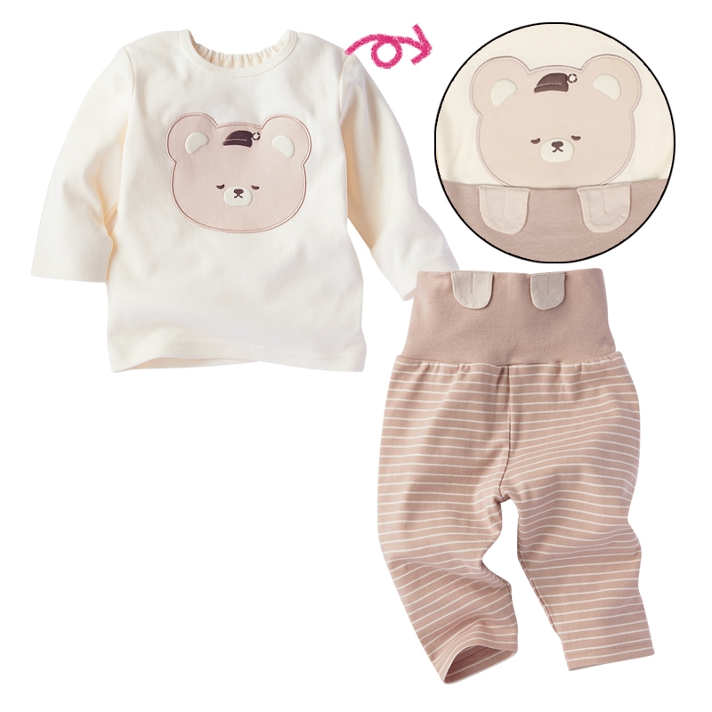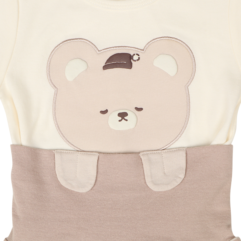 はじめてのパジャマデビューを迎えるベビー乳幼児用、秋向けのなりきりパジャマをご紹介致します。 素材は肌に優しい綿100%のスムースを使用、表面が柔らかくて肌触りがとても良いです。 トップスのお顔と、腹巻きについているおててのアップリケが合わさって、おやすみモチーフになるのが可愛い商品です。 オフシロ地のくまさん柄になります。