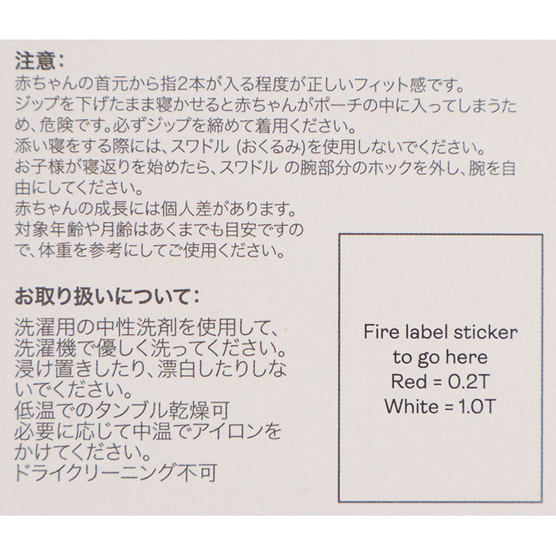 ・ジップを締めてご着用ください。添い寝をする際には、スワドル(おくるみ)を使用しないでください。