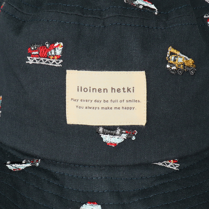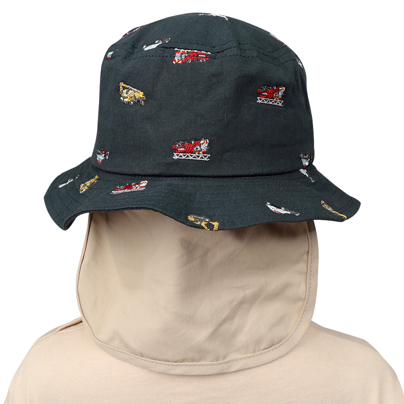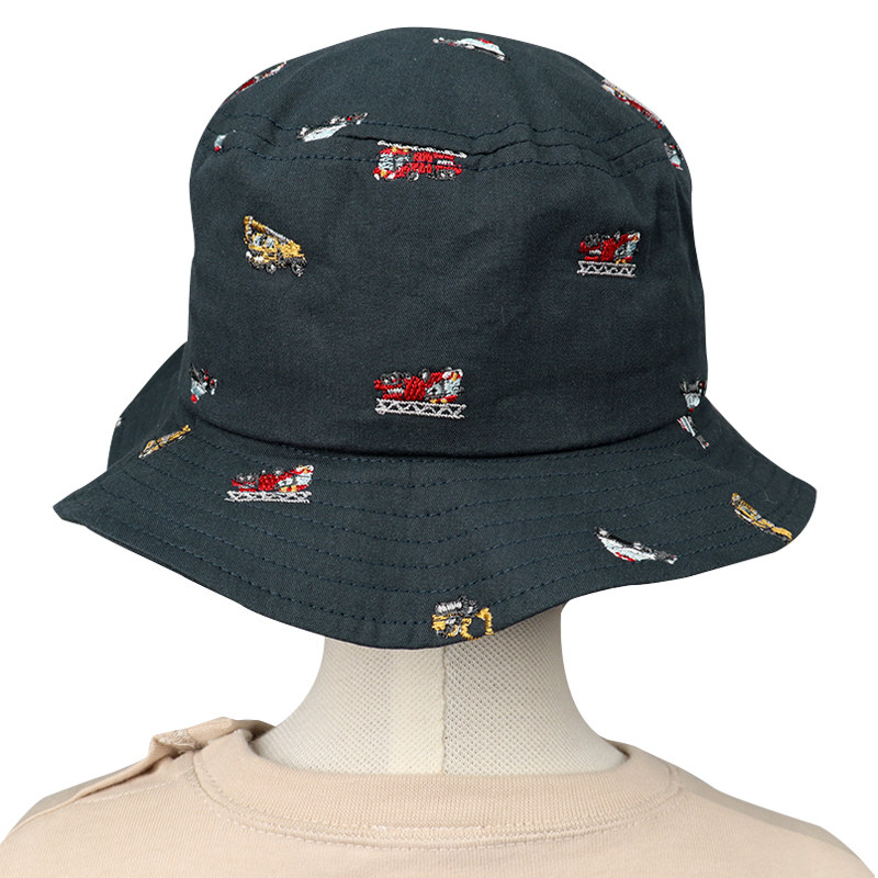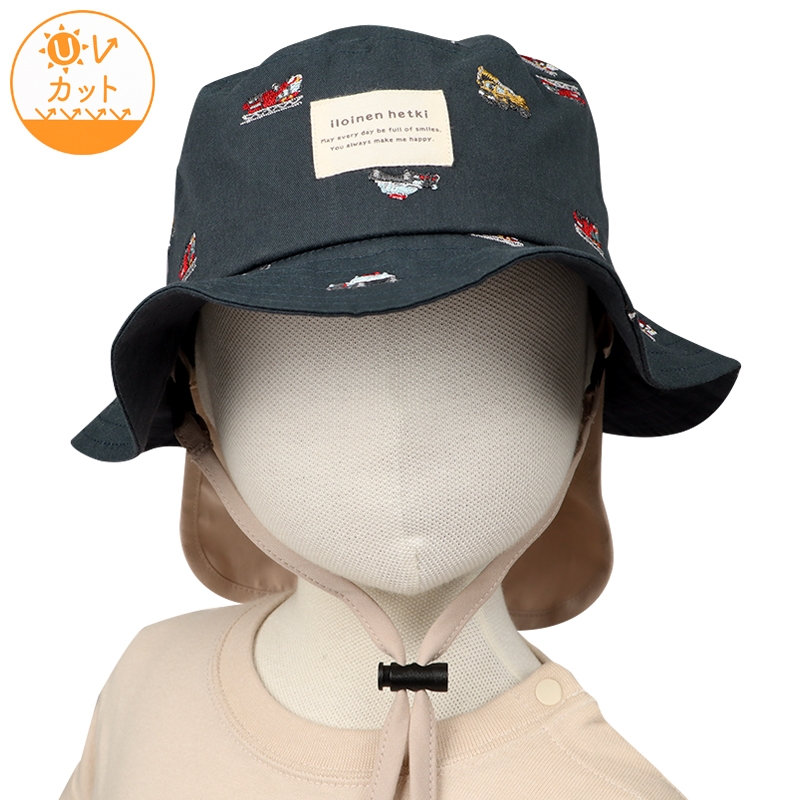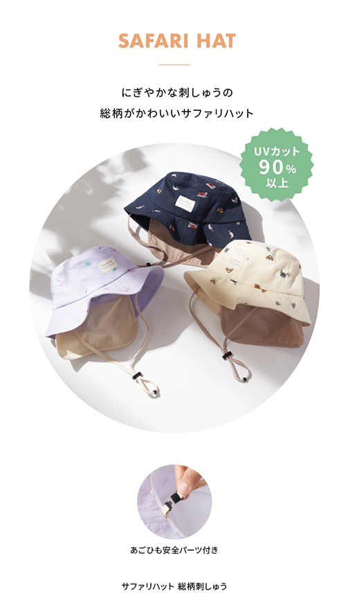 本体のぐるりを飾る、総柄刺繍が楽しいアイテムです。 可愛い、はたらくくるま柄が広がります。 フロントネームがこなれた印象をプラス。 外での活動に嬉しい日よけは取り外しもできます。 風などによる帽子の落下を防ぐ首紐付き。 首紐は、片方が強い力がかかると外れるジョイント仕様、もう片方がフック仕様になっています。