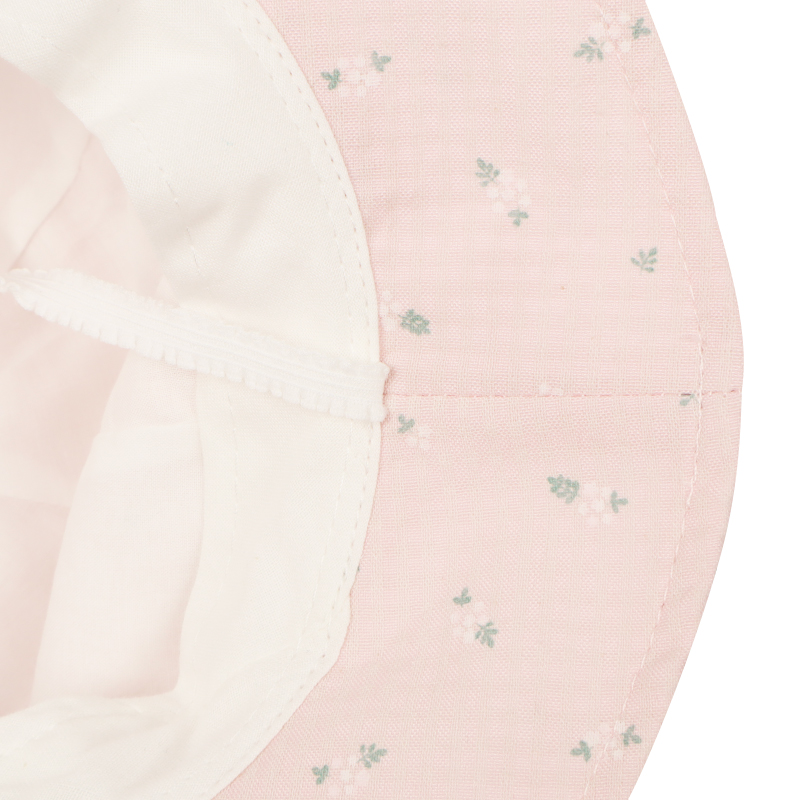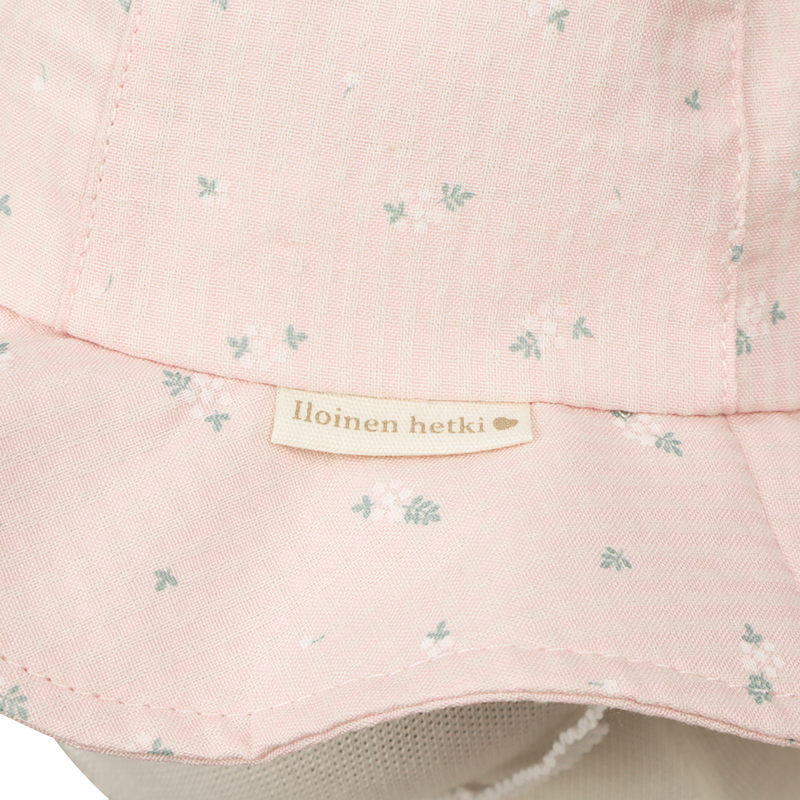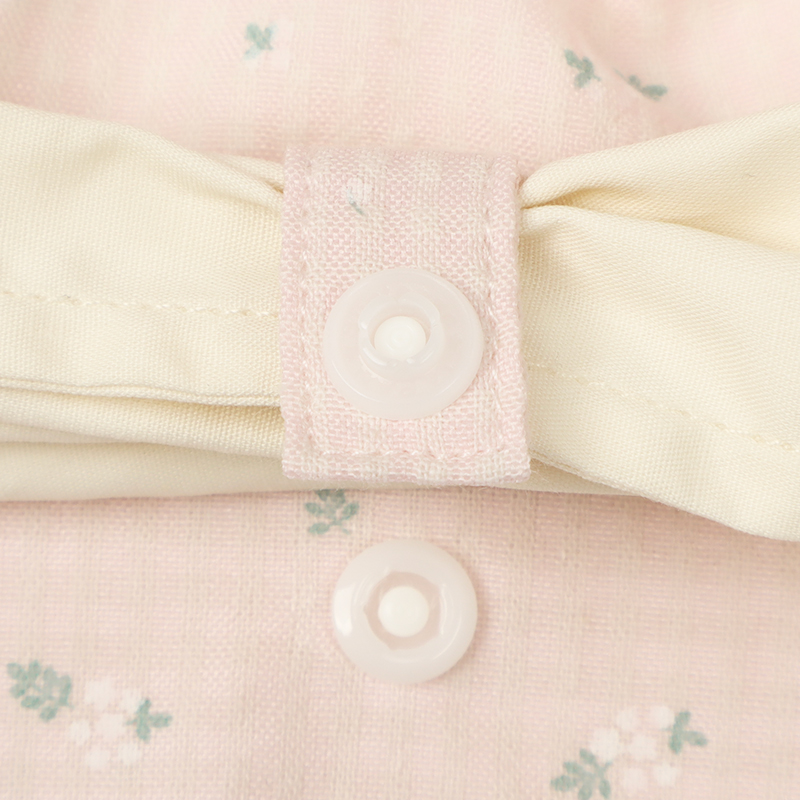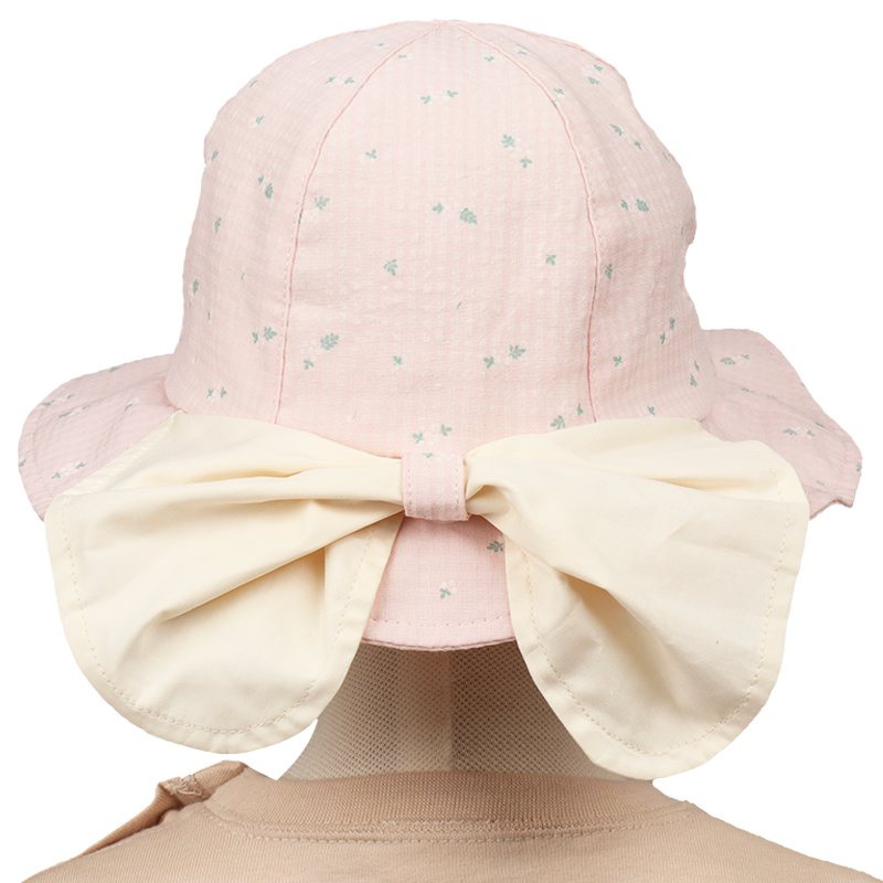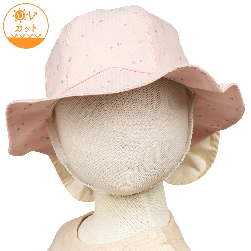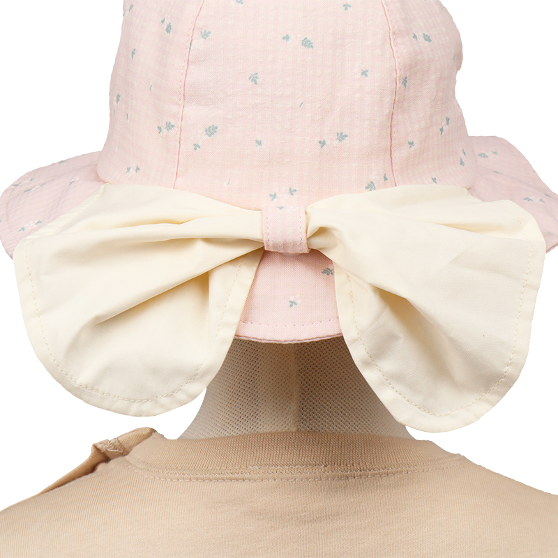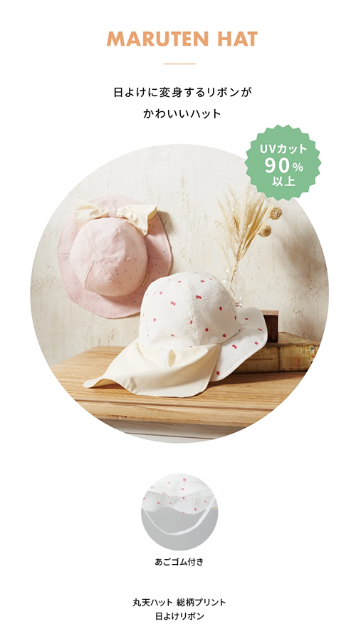 花柄プリントが映える、ガーリーテイストのアイテムです。 本体はやさしい配色のチェック柄により、爽やかな仕上がりに。 蝶々のように広がる、大きなリボンが後ろ姿を飾ります。 リボンは中心に留めたスナップボタンを外すと、日よけに早変わりします。 風などによる帽子の落下を防ぐアゴゴム付き。