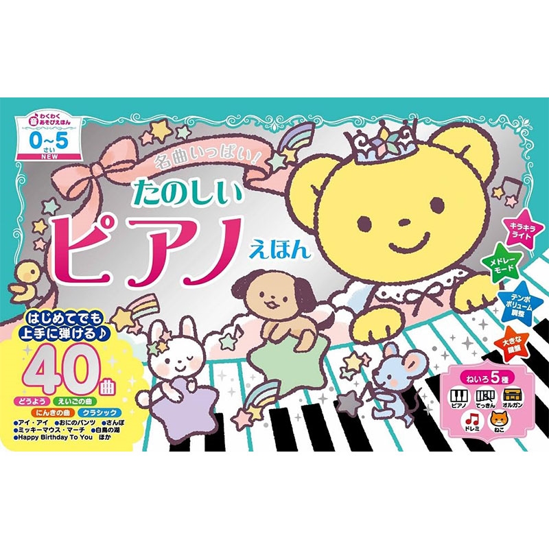 楽譜を見ながらピアノあそびがたのしめる 童謡から英語曲、そして定番クラシックまで、 だいにんきのメロディー40曲を収録。 鍵盤の音色は5種類。