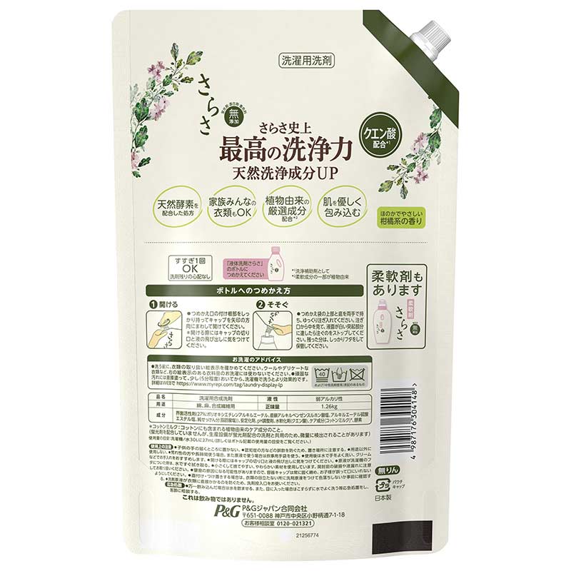 ●内容量:1260g ●成分:界面活性剤(27%:ポリオキシエチレンアルキルエーテル、直鎖アルキルベンゼンスルホン酸塩、アルキルエーテル硫酸エステル塩、純せっけん分(脂肪酸塩))、安定化剤、pH調整剤、水軟化剤(クエン酸)、ケア成分(コットンミルク) * 、酵素* コットンミルク:コットンにも含まれる植物由来のケア成分のこと。