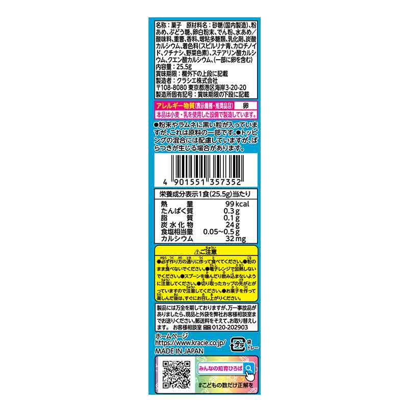 ●菓子 ●原材料名:砂糖(国内製造)、粉あめ、ぶどう糖、卵白粉末、でん粉、水あめ/酸味料、重曹、香料、増粘多糖類、乳化剤、炭酸カルシウム、着色料(スピルリナ青、カロチノイド、クチナシ、野菜色素)、ステアリン酸カルシウム、クエン酸カルシウム、(一部に卵を含む) ●内容量:25.5g ●栄養成分:その他 熱量 99kcal たんぱく質 0.3g 脂質 0.1g 炭水化物 24g 食塩相当量 0.05~0.5g カルシウム 32mg