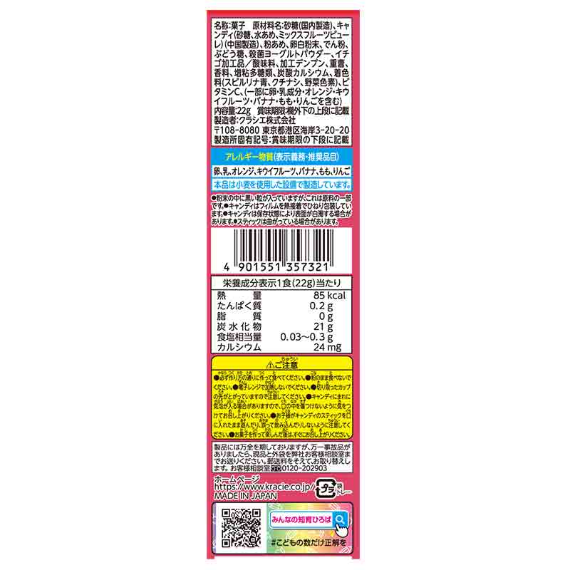 ●菓子 ●原材料名:砂糖(国内製造)、キャンディ(砂糖、水あめ、ミックスフルーツピューレ)(中国製造)、粉あめ、卵白粉末、でん粉、ぶどう糖、殺菌ヨーグルトパウダー、イチゴ加工品/酸味料、加工デンプン、重曹、香料、増粘多糖類、炭酸カルシウム、着色料(スピルリナ青、クチナシ、野菜色素)、ビタミンC、(一部に卵・乳成分・オレンジ・キウイフルーツ・バナナ・もも・りんごを含む) ●内容量:22g ●栄養成分:その他 熱量 85kcal たんぱく質 0.2g 脂質 0g 炭水化物 21g 食塩相当量 0.03~0.3g カルシウム 24mg