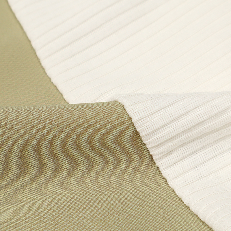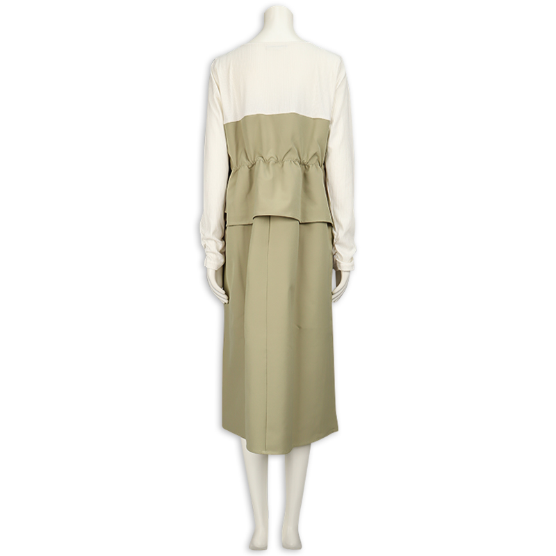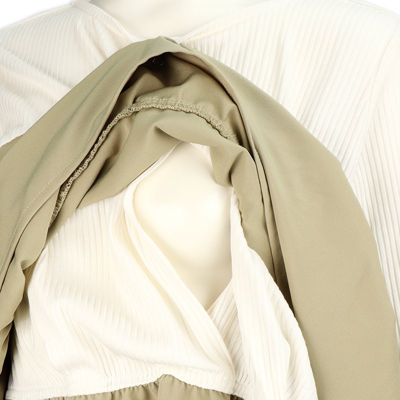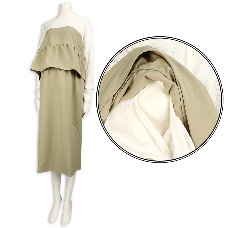 長袖の、異素材切り替えのドッキングワンピースとなります。 本体はツイル素材、別布部分はリブ素材となります。 ペプラムタイプのデザインとなります。 前身をめくって、授乳するタイプとなります。 ブラックとグリーンの2色展開です。