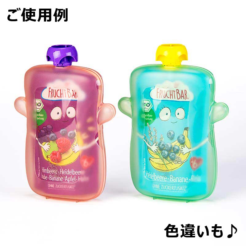 手で強く握ってジュレがこぼれるのを防止するパウチケースです。 パウチを直接持たないから、あふれ出す心配がありません。 両サイドの突起で指がすべりにくく上手に持てます。押し出すのではなくしっかり吸って飲む練習もできます。 いろんなサイズのジュレに対応。 でっぱりに指をかければお子さまでももちやすい。
